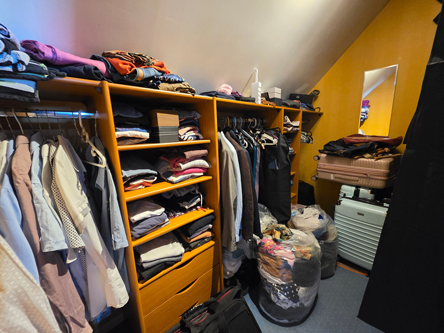 Le bien se compose au rez-de-chaussée : entrée avec visiophone, couloir avec placard et thermostat, grand séjour avec cuisine ouverte aménagée/équipée (îlots et chaises compris), chambre, WC avec lave-mains et placard. À l'étage : couloir, deux chambres dont une avec point d'eau et rangements, salle de bains avec douche et sèche-serviette, WC avec VMC, dressing complet. Sous sol total.