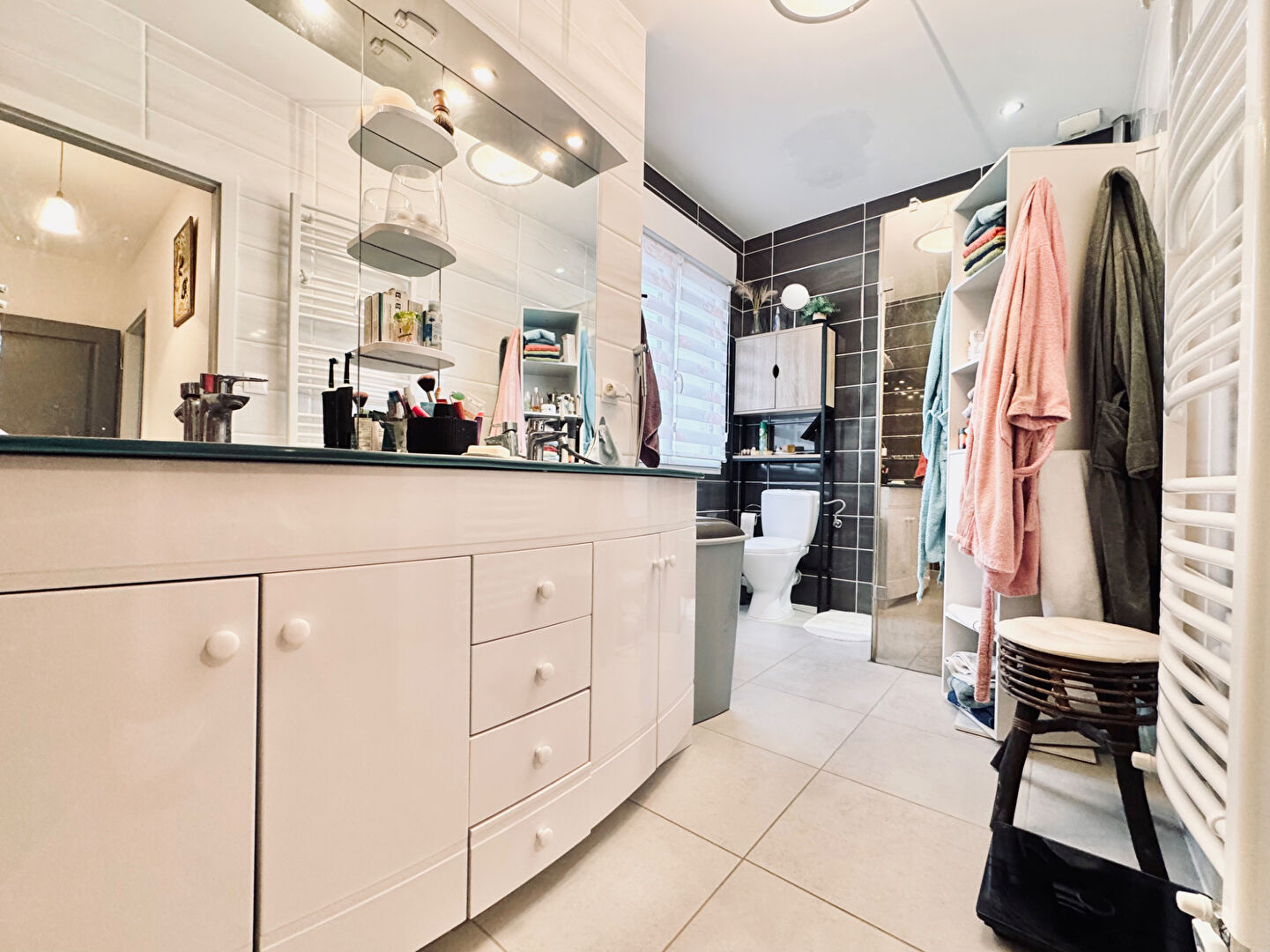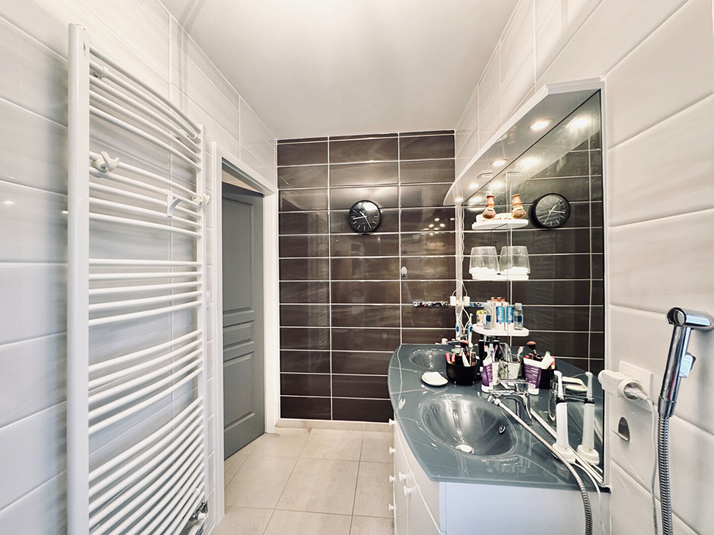 La salle de douche familiale, contemporaine, dispose d'une douche à l'italienne, d'un meuble double vasque et d'un sèche-serviettes.