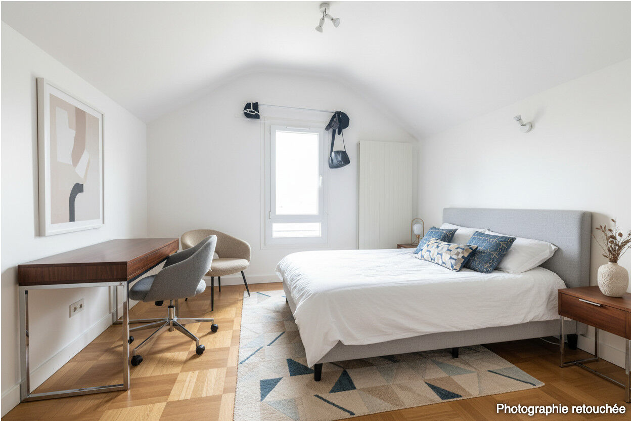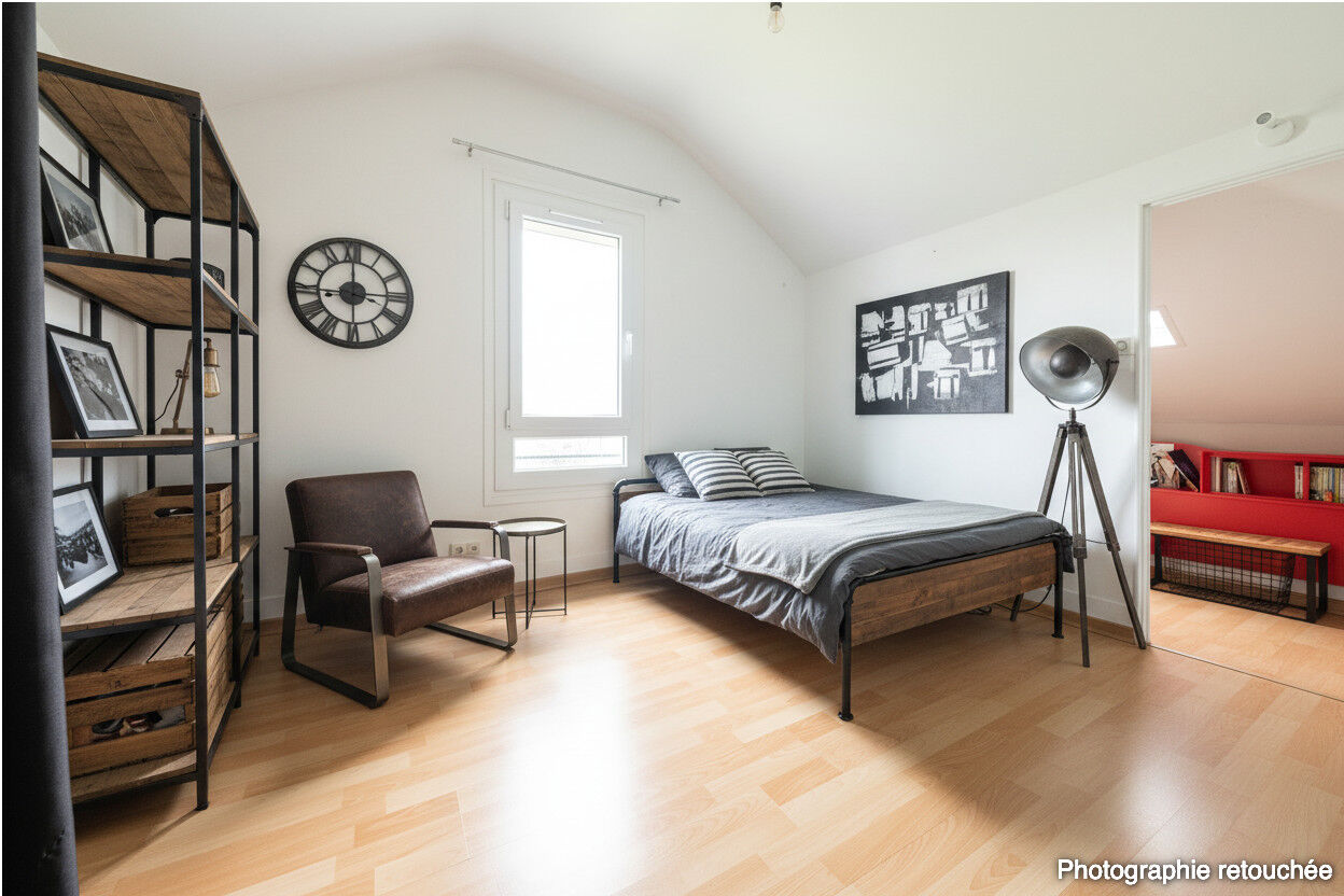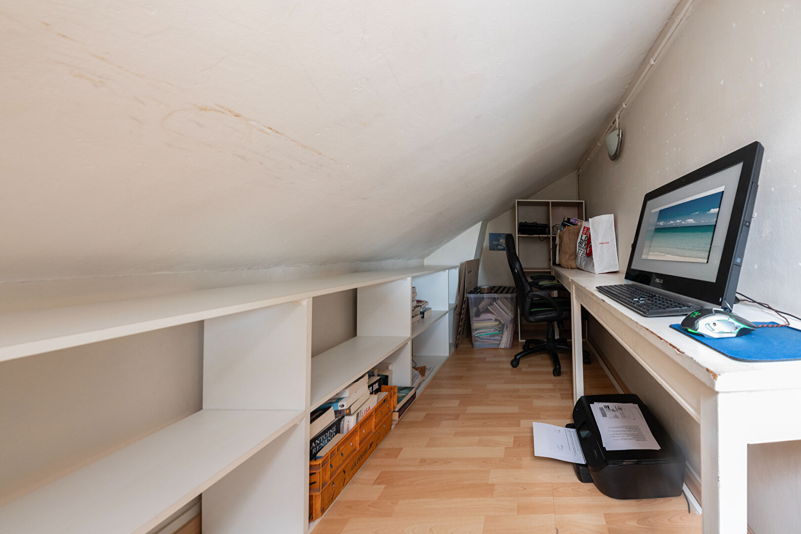 A l'étage, vous disposerez d'un pallier avec coin bureau, 2 chambres et combles utiles pour du rangement, dressing et stockage.