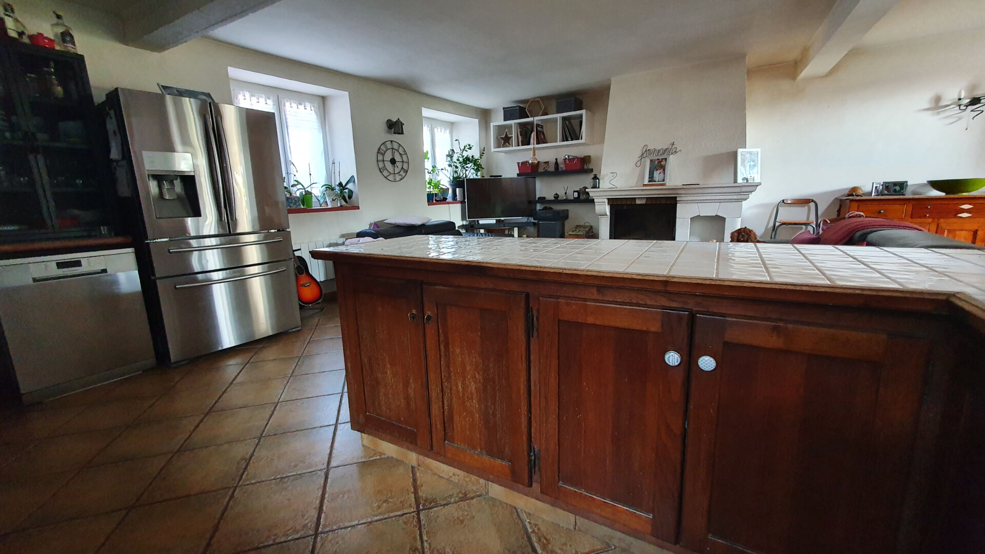 Elle se compose au rez-de-chaussée d'un espace de vie chaleureux avec un salon cathédrale, équipé d'une cheminée avec insert, idéal pour les soirées d'hiver. Une extension lumineuse accueille un second espace de vie avec poêle à granulés, ouvert sur le jardin.