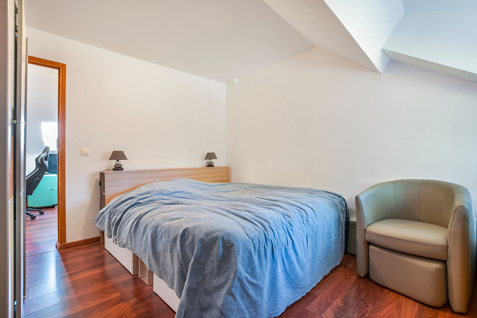 A l'étage, un escalier vous emmènera sur une grande pièce palière pouvant servir de bureau ou de deuxième chambre et une deuxième chambre en enfilade.