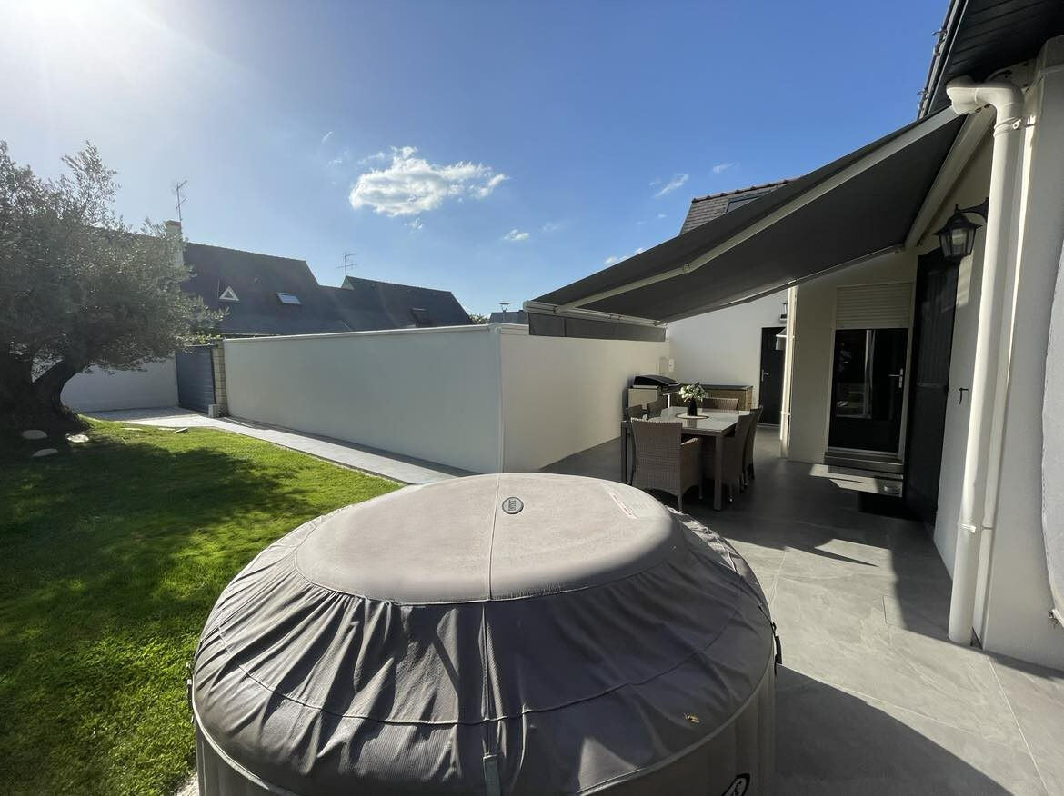 Côté extérieur, la maison bénéficie d'une grande terrasse carrelée exposée SUD, d'un beau jardin paysagé et de plusieurs stationnements (garage + places de parking).