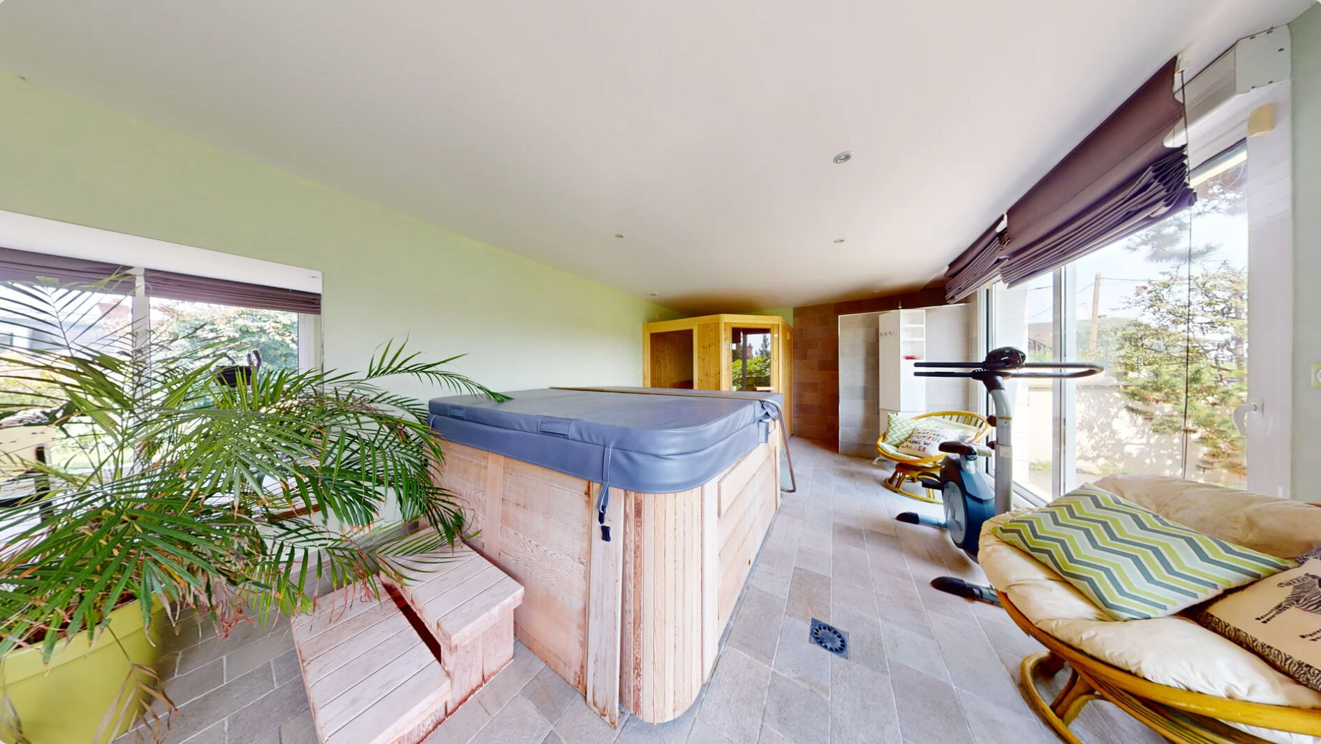 Au rez-de-jardin, place à la détente : salle de cinéma avec sonorisation, espace spa complet (jacuzzi, sauna, salle de sport), bureau, atelier, buanderie, cave à vin? chaque espace a été pensé pour conjuguer confort, intimité et loisirs à domicile.