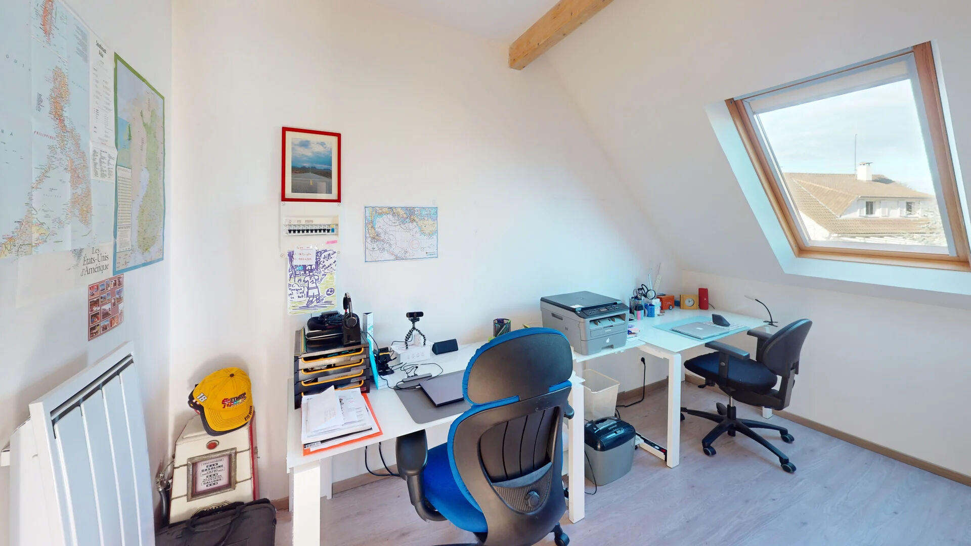 A l'étage, un grand palier et bel espace de vie, deux chambres spacieuses avec rangements, un bureau et une salle d'eau avec wc.