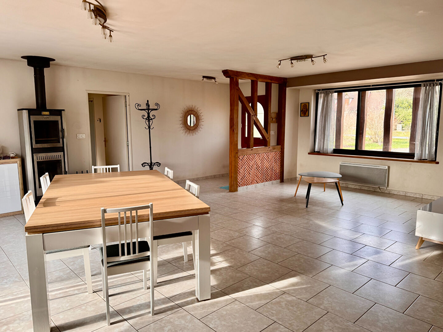 Entrée avec colombage donnant sur une spacieuse pièce de vie d'environ 60 m² avec poêle à granulés et accès direct sur la terrasse.