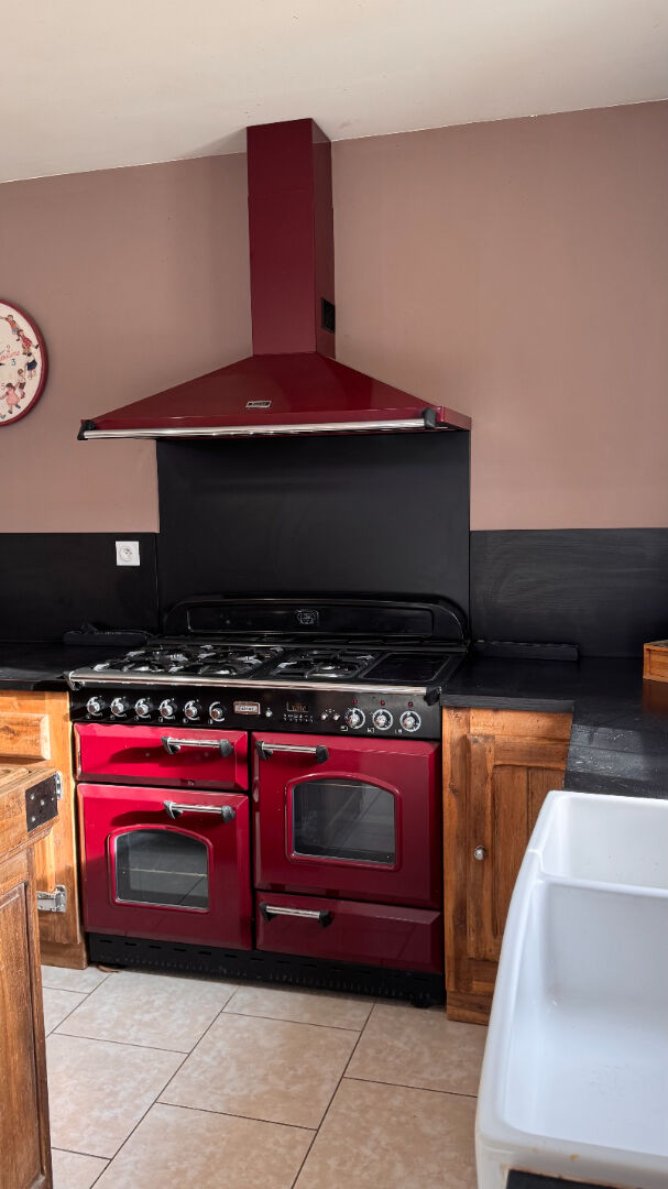La cuisine ouverte, entièrement aménagée avec son piano de cuisson et ses meubles esprit "boucherie" allie caractère et authenticité.
