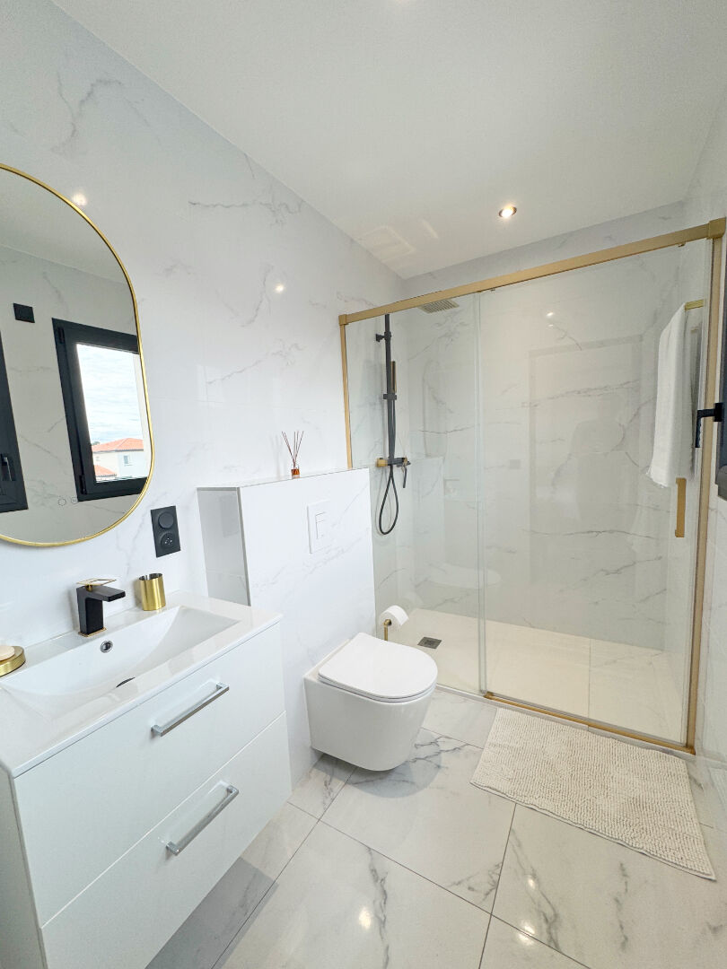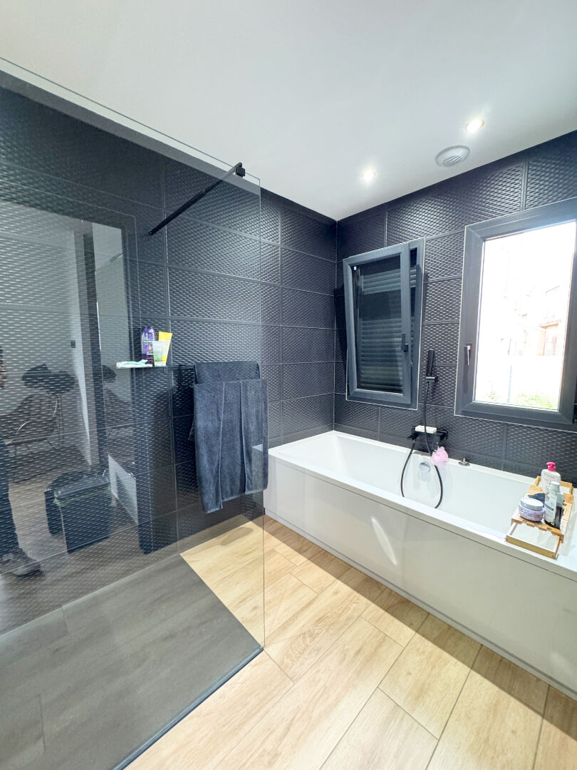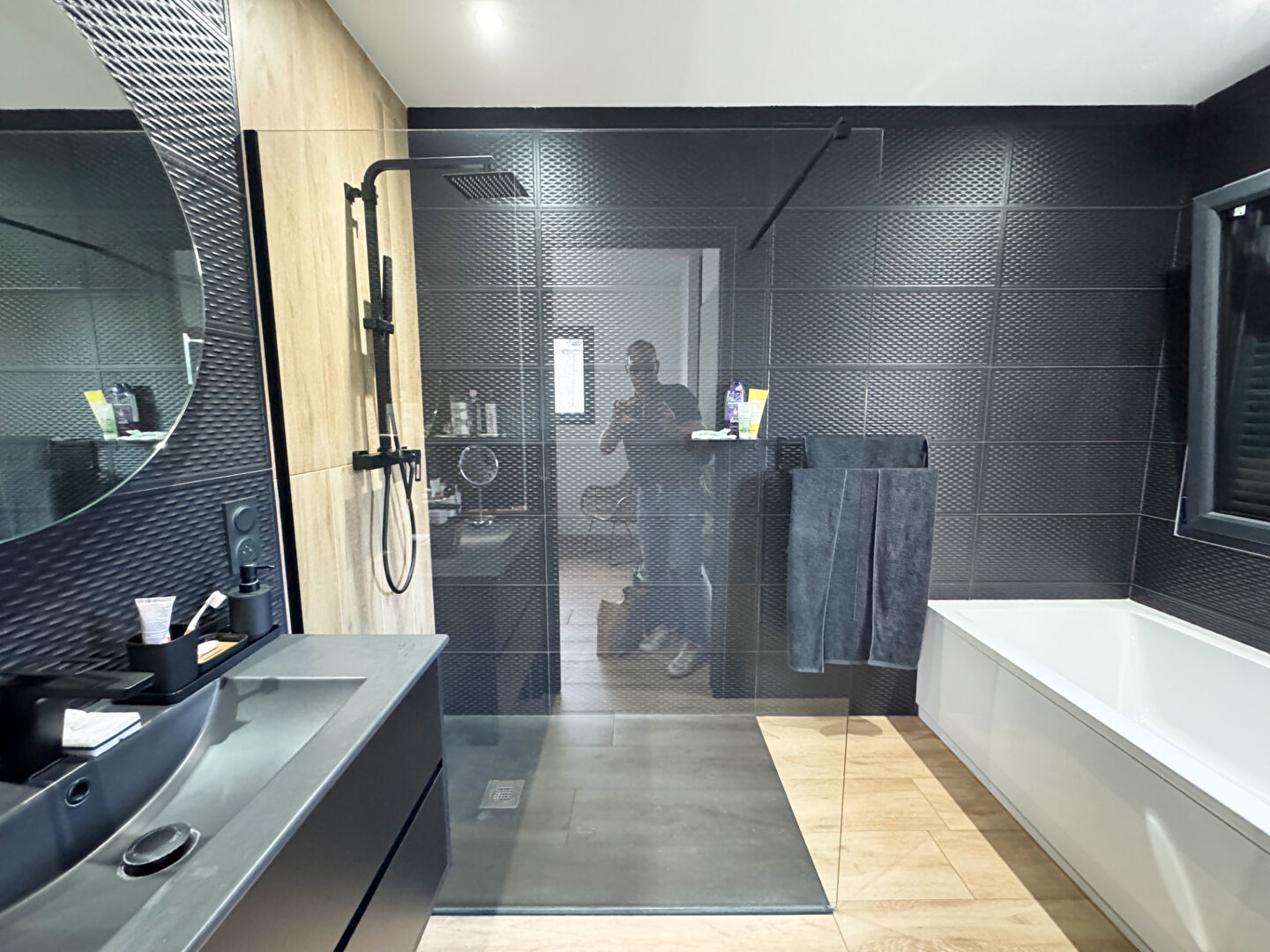 Au rez-de-chaussée, la suite parentale offre un véritable cocon d'intimité avec une salle de bain complète comprenant baignoire et douche à l'italienne, ainsi qu'un dressing sur-mesure. À l'étage, chaque chambre dispose de sa propre salle d'eau et de rangements intégrés, garantissant autonomie et confort pour toute la famille. L'une d'entre elles bénéficie même d'une grande terrasse de 25 m², parfaite pour un espace détente ou bureau à ciel ouvert.