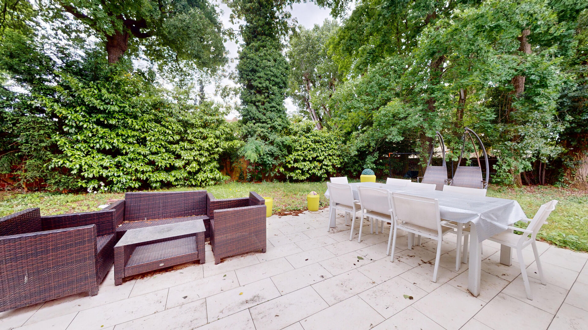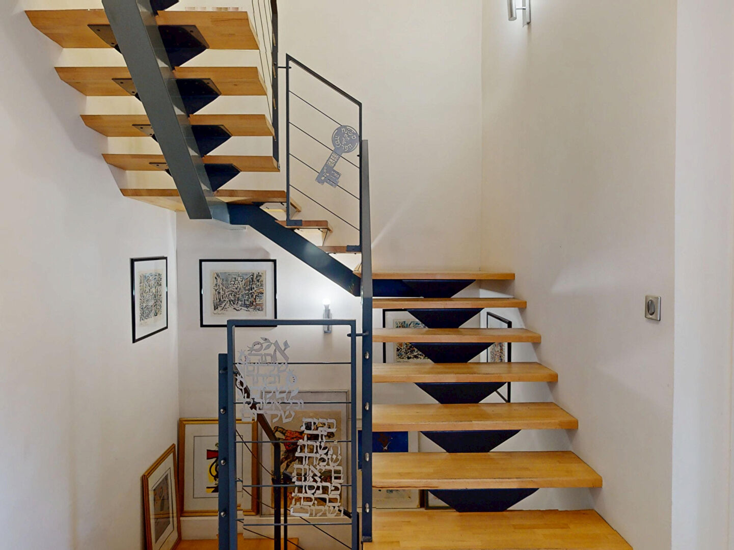 En retrait de la rue, au calme, elle vous accueille par une grande pièce de vie baignée de lumière de 50m2, prolongée par un jardin arboré exposé sud-est, véritable écrin de verdure avec un arbre centenaire en toile de fond et une belle terrasse de 50 m2. La cuisine contemporaine ouverte, parfaitement intégrée, prolonge naturellement les espaces de réception. L'ensemble est sublimé par un escalier bois & acier, qui donne une touche industrielle élégante.