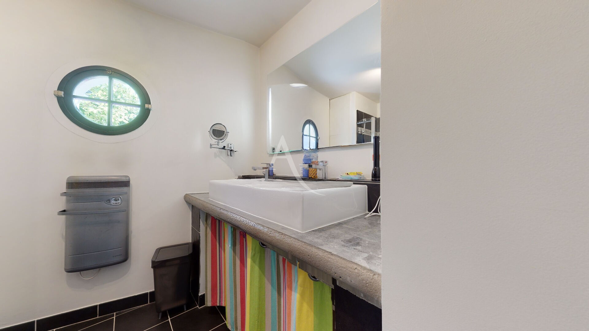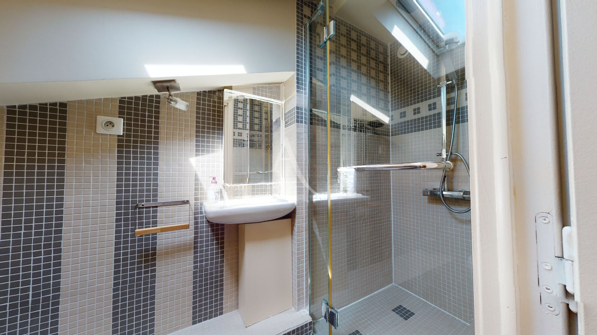 A l'étage, sous les combles, sans que cela n'en gêne l'habitabilité, une chambre spacieuse bénéficie d'une salle d'eau italienne tapissée de mosaïques.