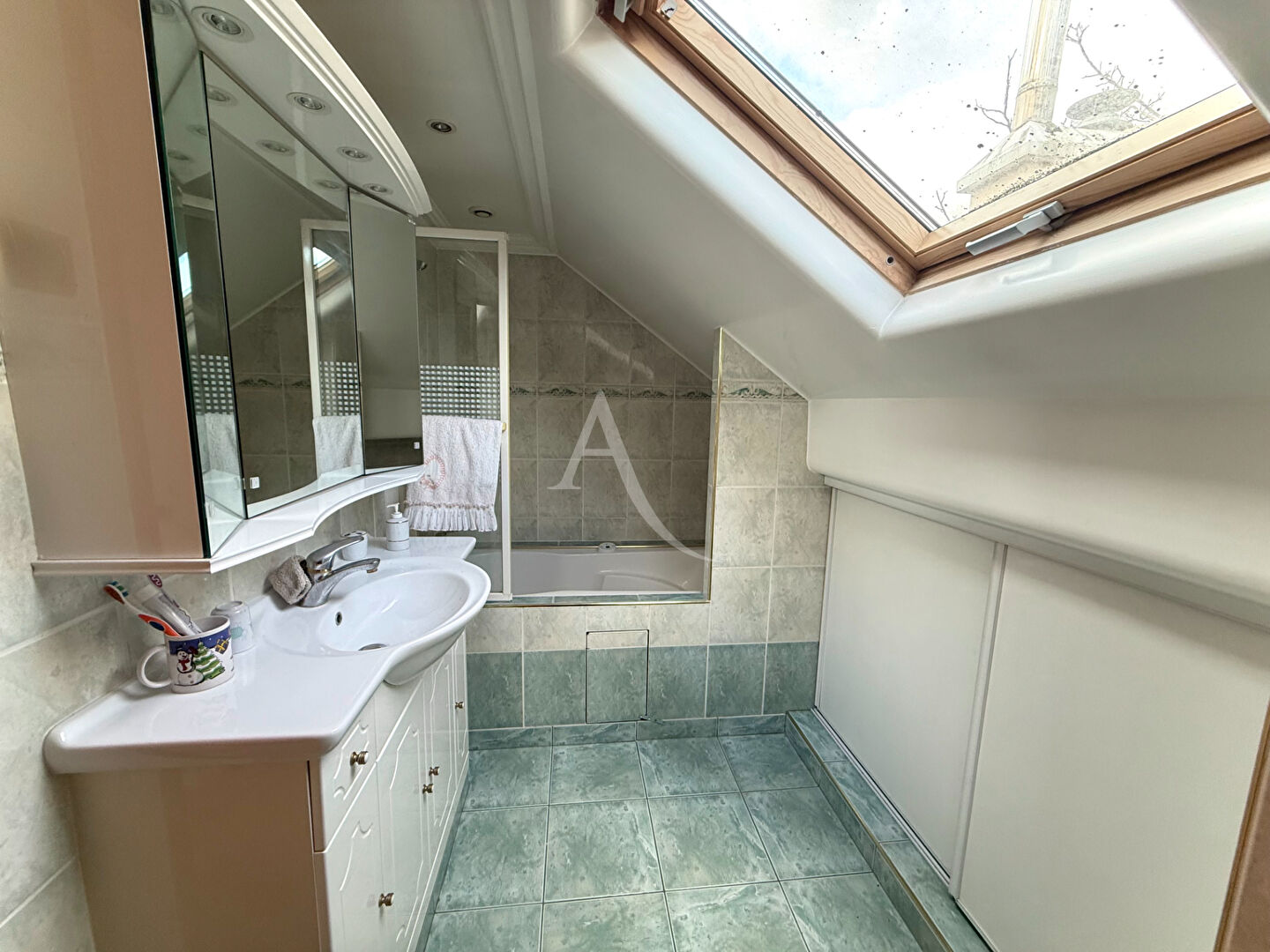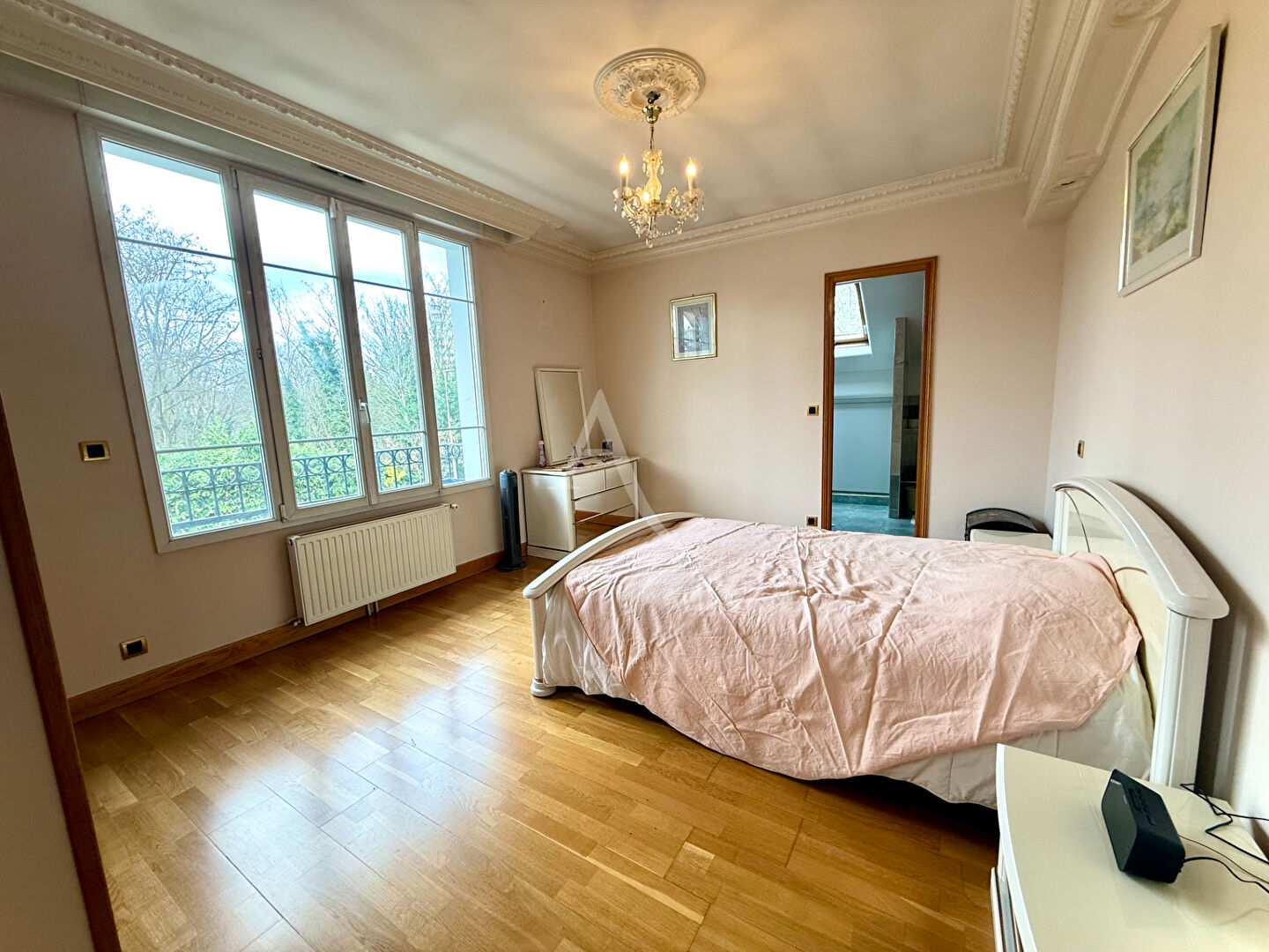 À l'étage, le palier distribue trois chambres, dont une disposant de sa propre salle d'eau, offrant une configuration particulièrement adaptée à la vie familiale.
