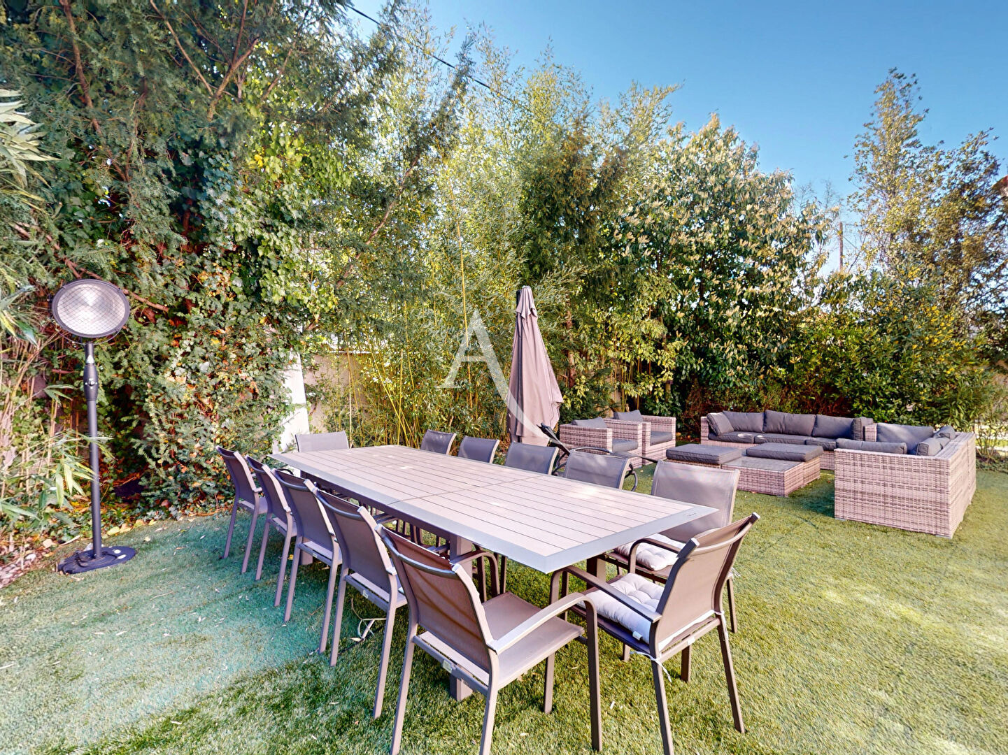 À l'extérieur, le jardin paysager, exposé Est, Ouest, Sud, et la terrasse ensoleillée composent un cadre intime et apaisant, propice aux déjeuners d'été, aux soirées entre amis et aux moments de détente à l'abri des regards.
