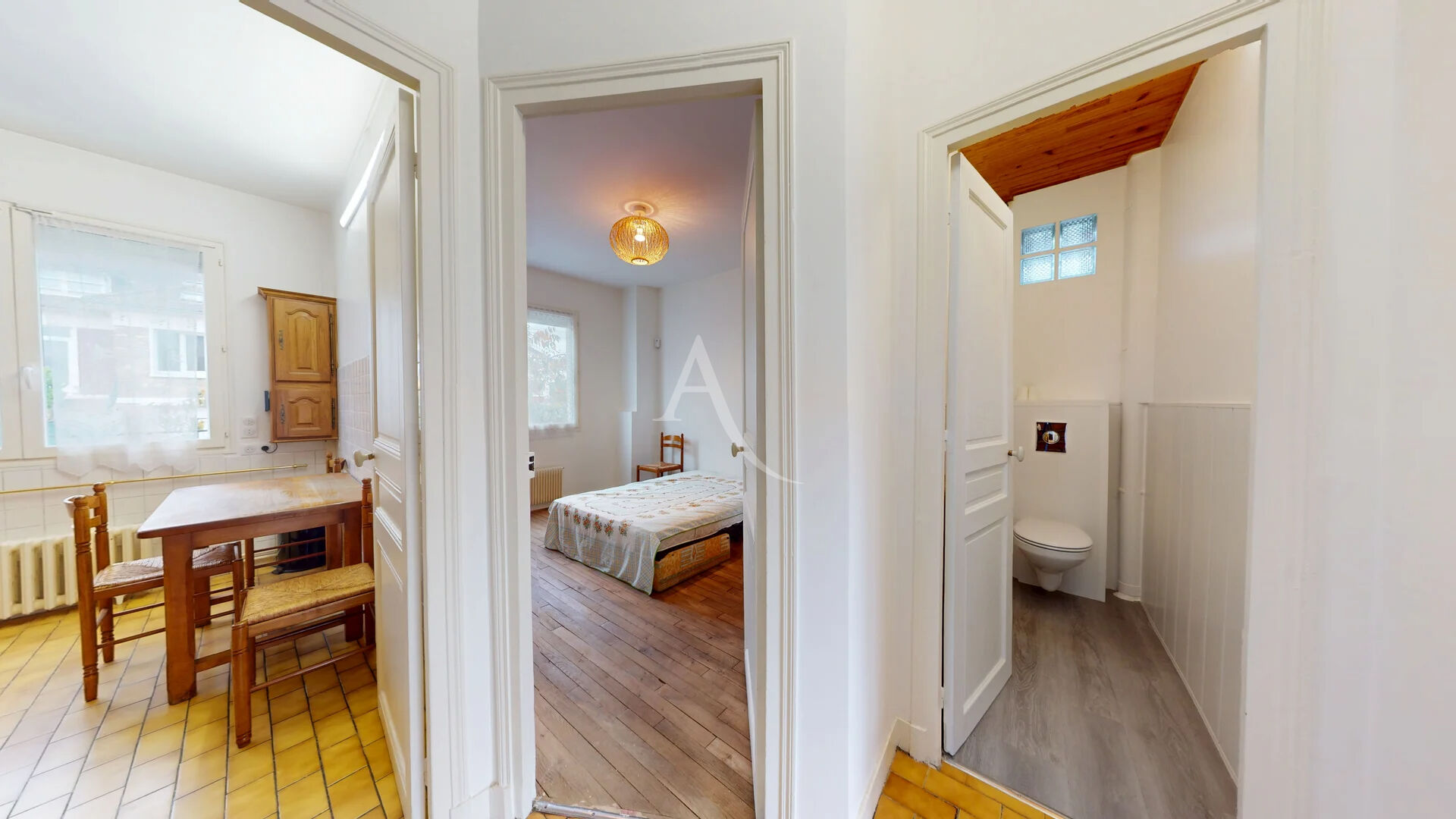 Le rez-de-chaussée s'organise autour d'une entrée chaleureuse, d'une cuisine fonctionnelle, d'un séjour baigné de lumière, de WC indépendants et d'une première chambre, idéale pour une vie de plain-pied ou un espace d'appoint.