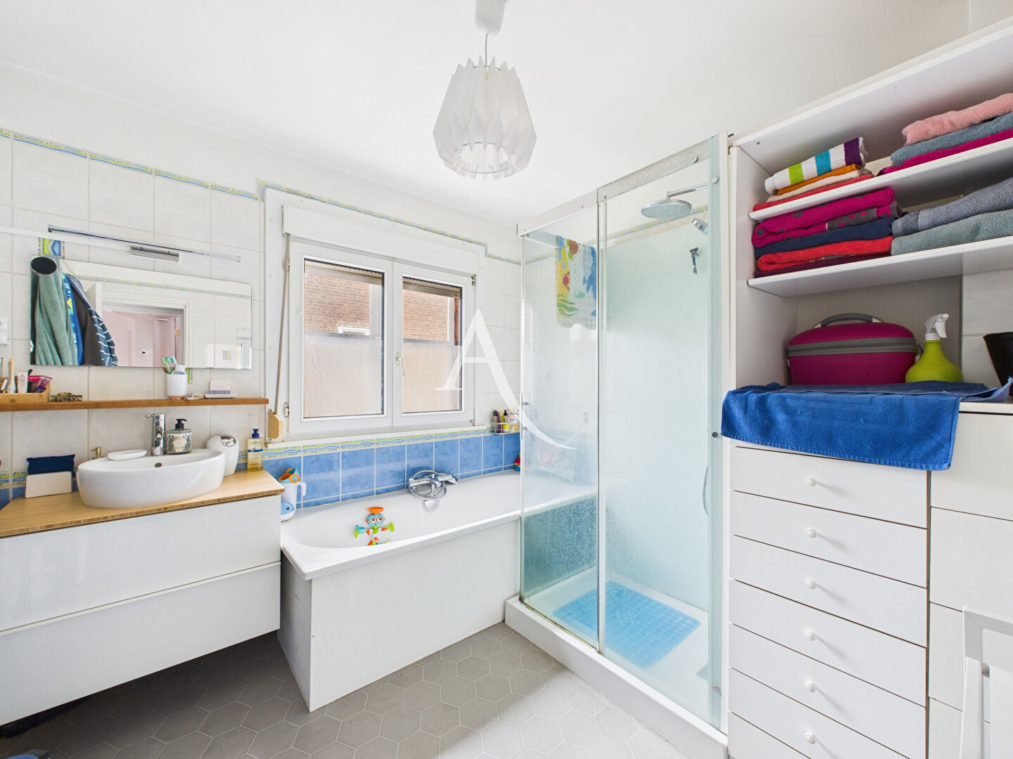 À l'étage, un palier distribue une salle de bains avec douche et baignoire, un bureau pouvant servir de chambre d'enfant, ainsi que deux chambres lumineuses.