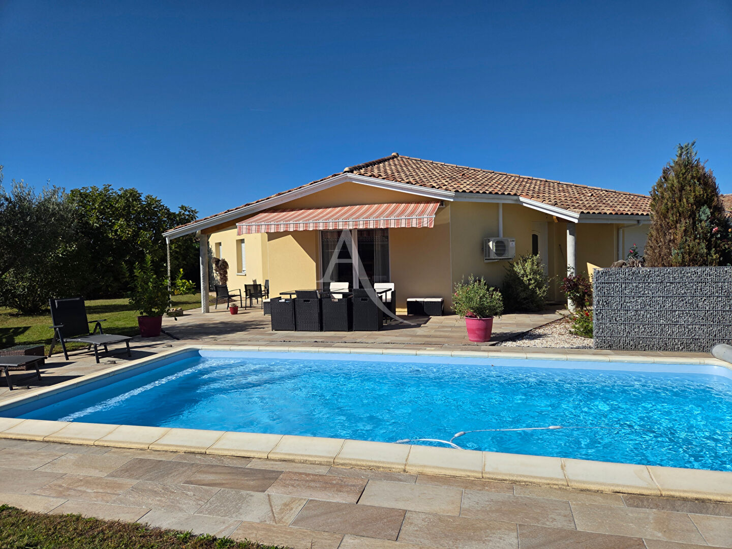À l'extérieur, le terrain d'environ 912 m2 est entièrement clos et sécurisé grâce à un portail électrique avec visiophone. Vous apprécierez le carport attenant, la terrasse équipée d'un store banne, ainsi que la piscine enterrée au sel en autogestion. Un garage indépendant et fermé vient compléter l'ensemble.