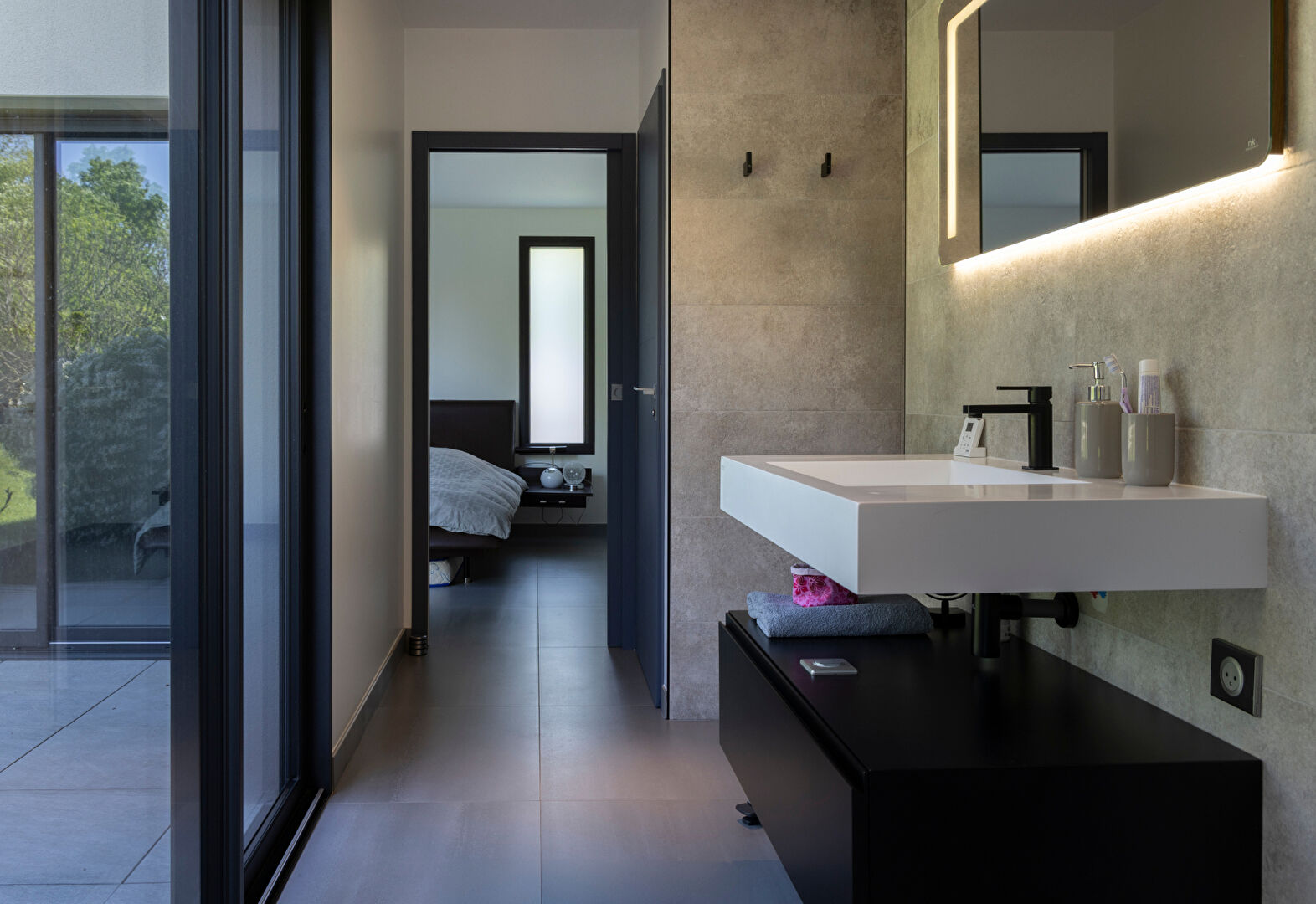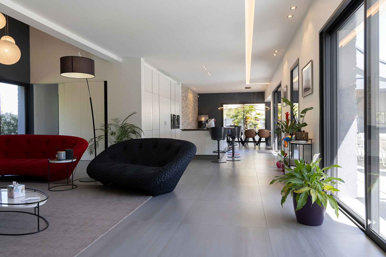 Dès l'entrée, vous serez séduit par l'architecture contemporaine aux lignes épurées, les grandes baies vitrées laissant entrer la lumière naturelle à profusion. Le vaste séjour, avec ses volumes impressionnants, s'ouvre sur une terrasse orientée plein sud. Que ce soit pour recevoir vos invités ou profiter de moments de détente, cet espace est une invitation à l'art de vivre.