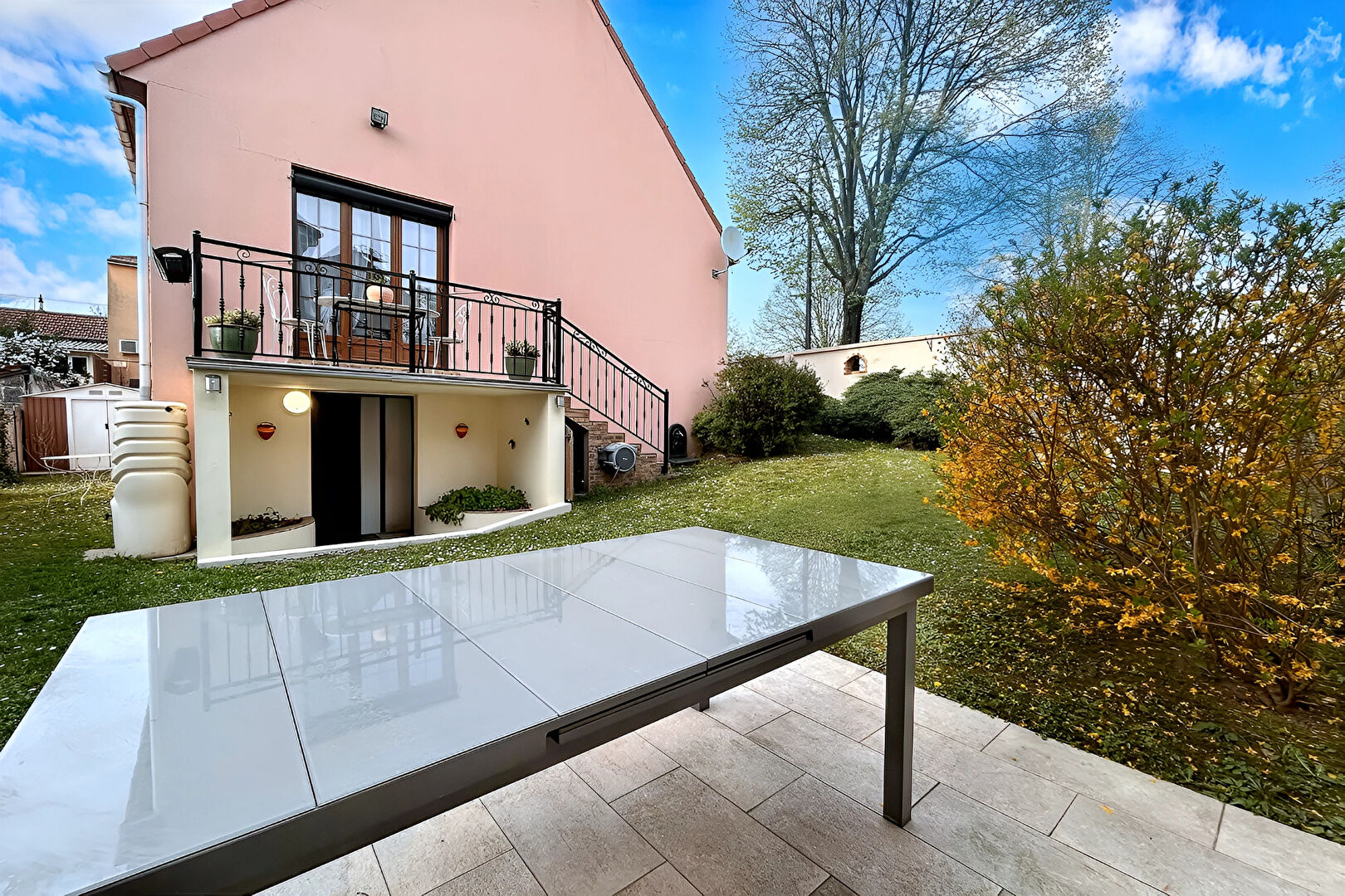 Un jardin intimiste avec une double terrasse et un abri de jardin accompagnent ce bien.
