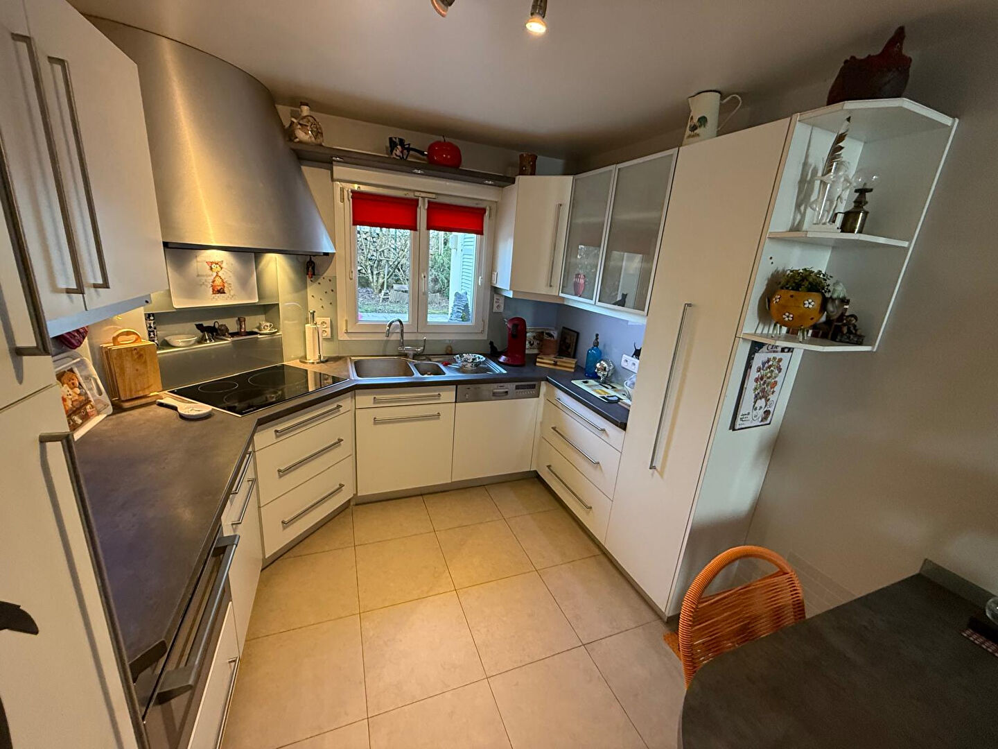 Au rez-de-chaussée, vous découvrirez un vaste espace salon-séjour d'environ 50 m², baigné de lumière, offrant un cadre de vie convivial et chaleureux. Des demi-niveaux vous mènent à une cuisine entièrement équipée, parfaitement intégrée à l'ensemble.