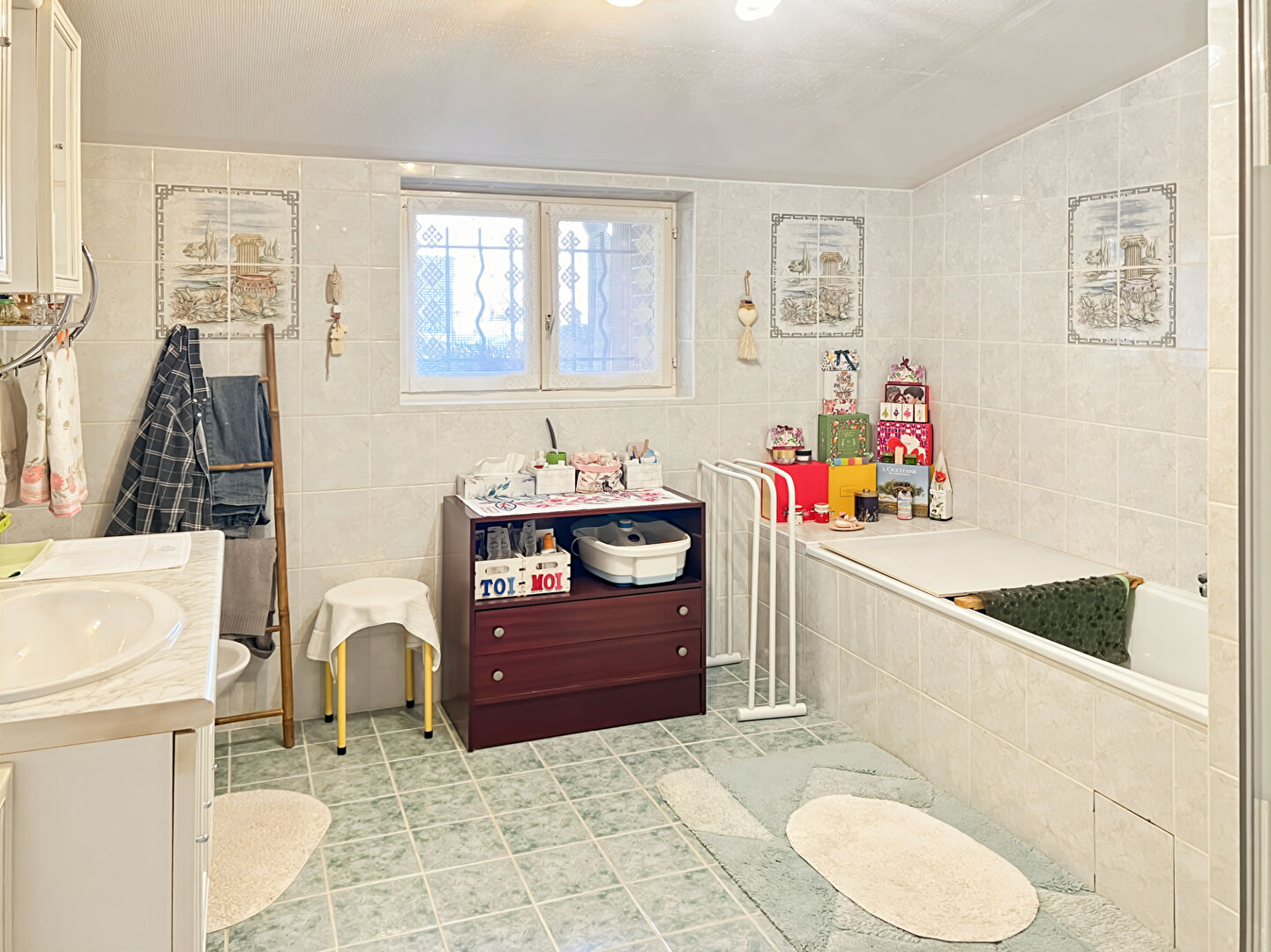 - Salle de bains avec baignoire et douche, radiateur sèche-serviettes ;