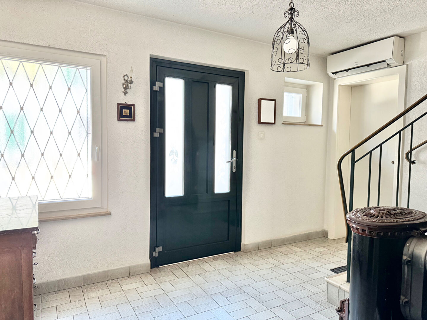 Le chauffage est mixte : électrique (3 unités de climatisation réversible par pompe à chaleur), complété par un poêle à bois placé au rez-de-chaussée. Cheminée dans le salon toujours fonctionnelle.