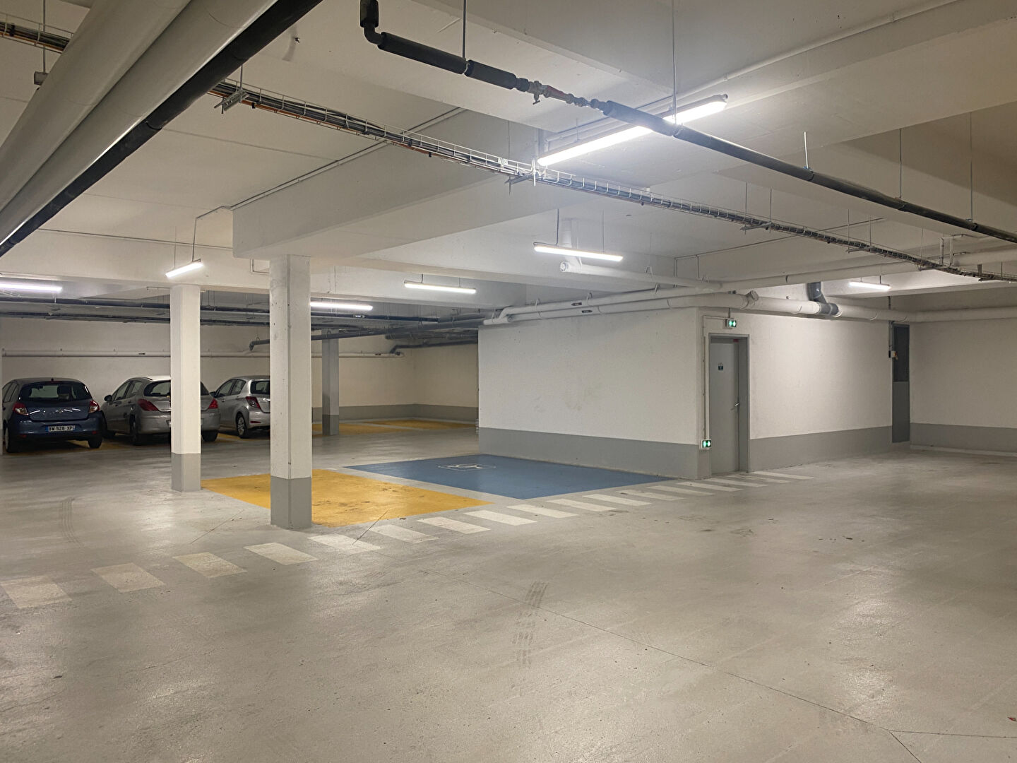 Photo : emplacement avec marquage au sol en bleu (norme handicapée)