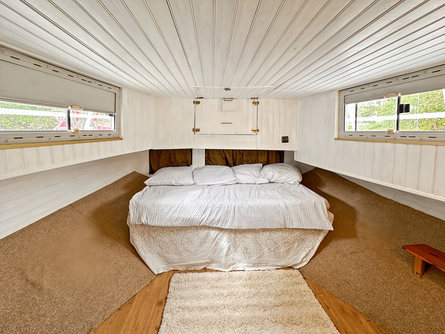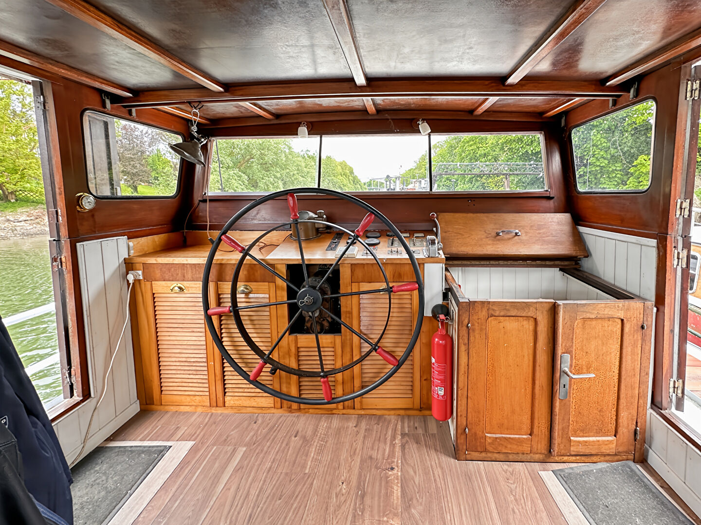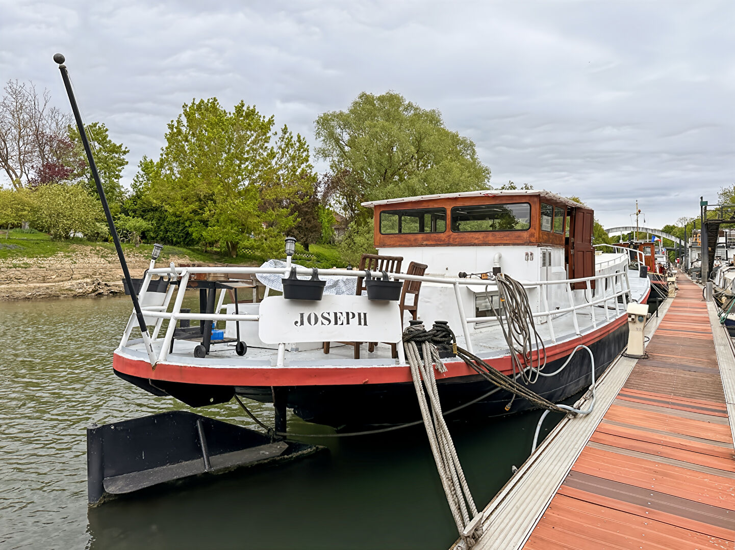 Le bateau de 20,19 m de long par 4,48 m de large est arrimé au port privé de Poissy, un espace sécurisé et verdoyant à proximité directe de la gare et des commodités.