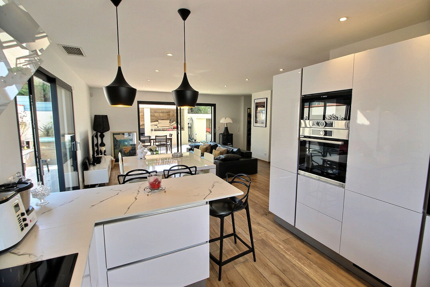 A Ventre Cabestany en Exclusivité réf: J1065 - Venez découvrir cette villa construite avec des matériaux hors pair, développant 138 m² de surface habitable. En rez-de-chaussée, belle pièce de vie avec cuisine us entièrement équipée, buanderie , wc et coin lavabo.