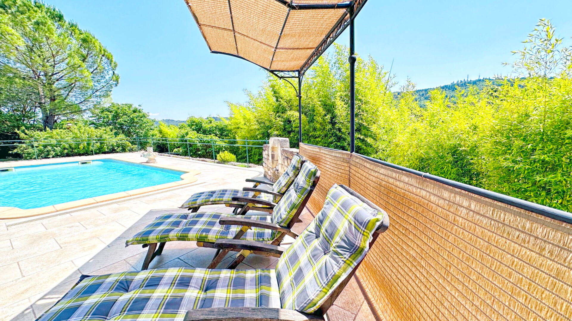 À l'extérieur, côté Sud, une grande terrasse couverte a été aménagée avec une douche, donnant sur une belle piscine de 8x4 m, parfaite pour profiter des journées ensoleillées.