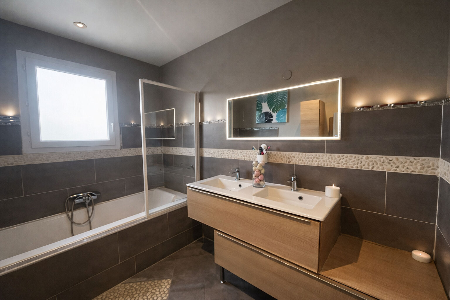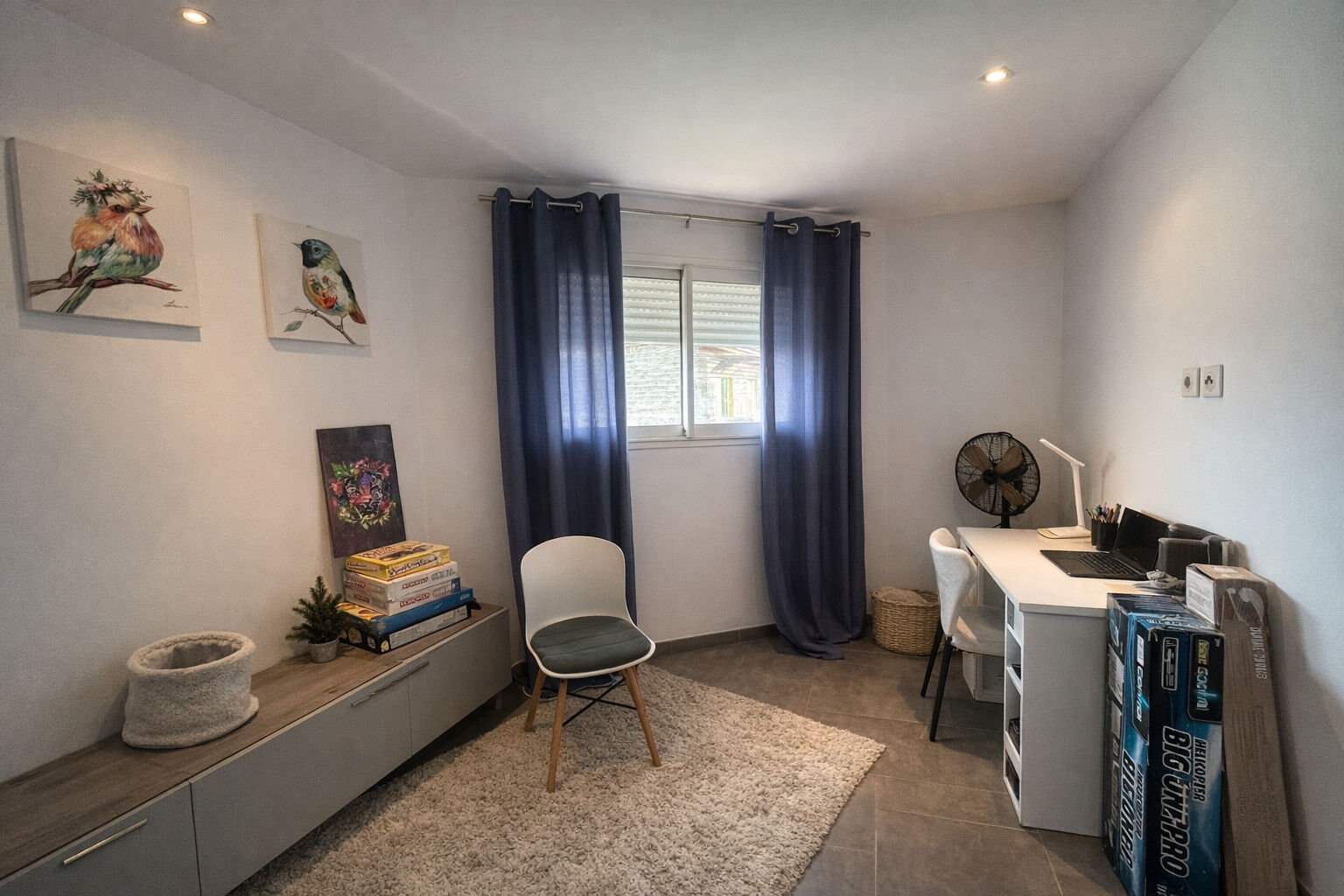 À l'étage, l'espace nuit se prolonge avec deux chambres confortables, un bureau idéal pour le télétravail et une salle de bains familiale, permettant à chacun de trouver son intimité.