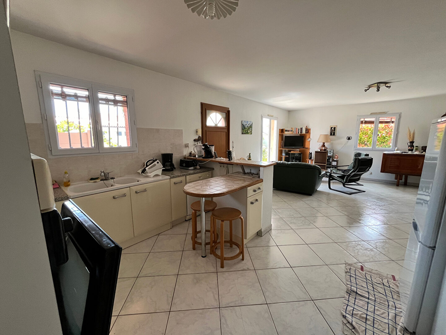 Villa T4 toute de PLAIN PIED... Elle composée de: Entrée, salon séjour cuisine ouverte (47M2) , 3 chambres, salle d'eau et wc... A cela s'ajoute terrasse, jardin, garage de 16m2 et une place de parking privative. Villa confortable climatisée...