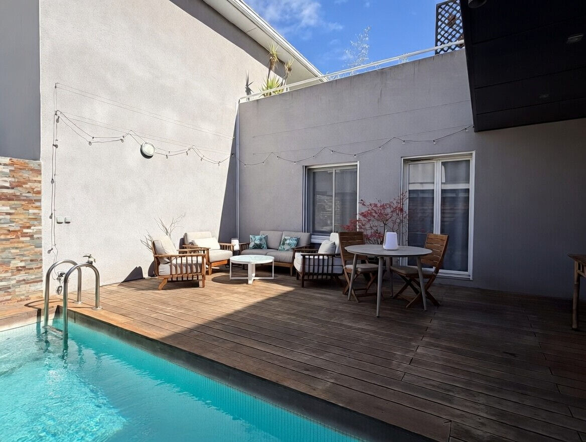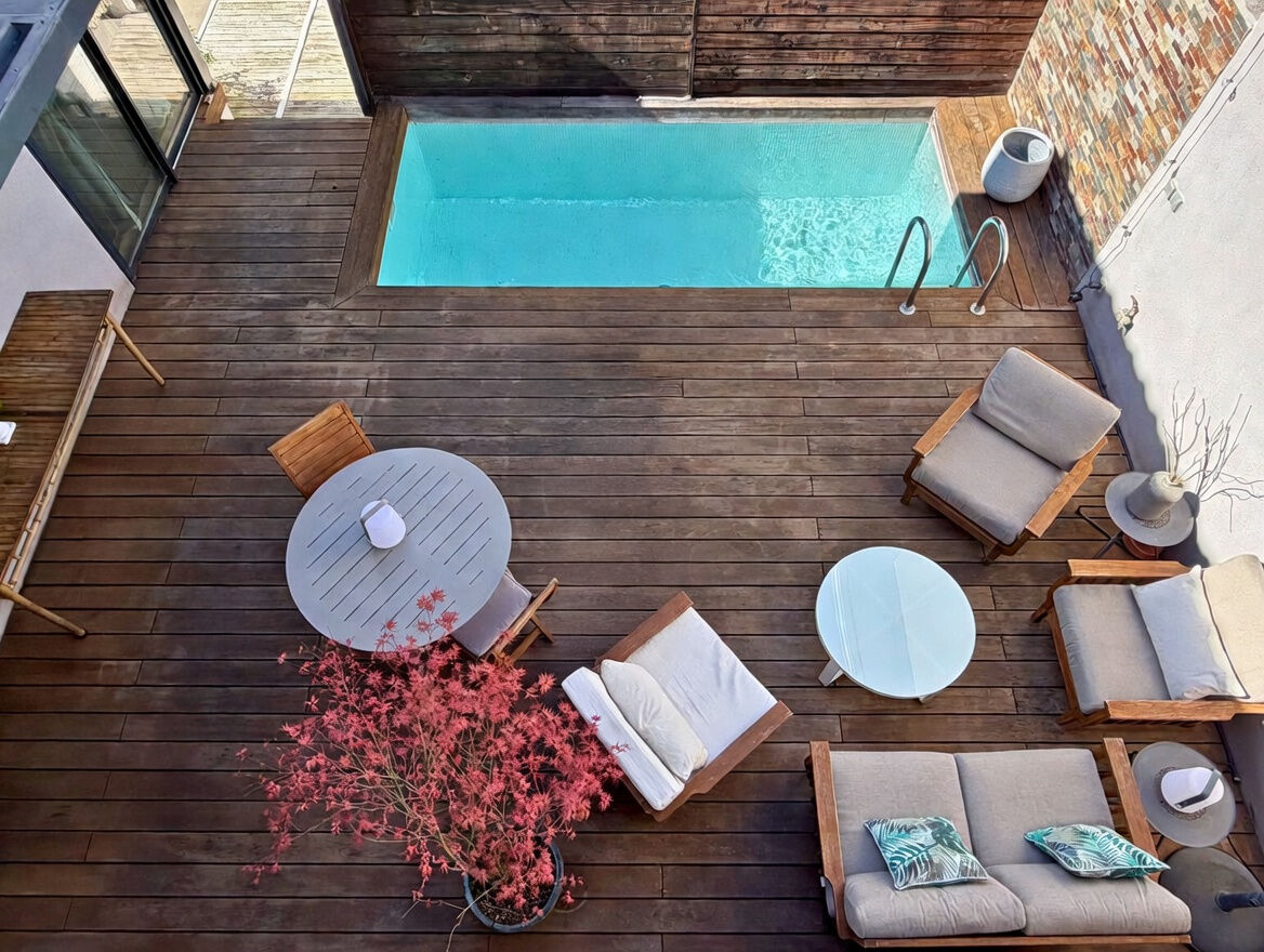 Vous apprécierez également l'intimité d'une mini-piscine lovée dans un patio couvert d'une chaleureuse terrasse en bois avec son abri au look cabanon de plage.