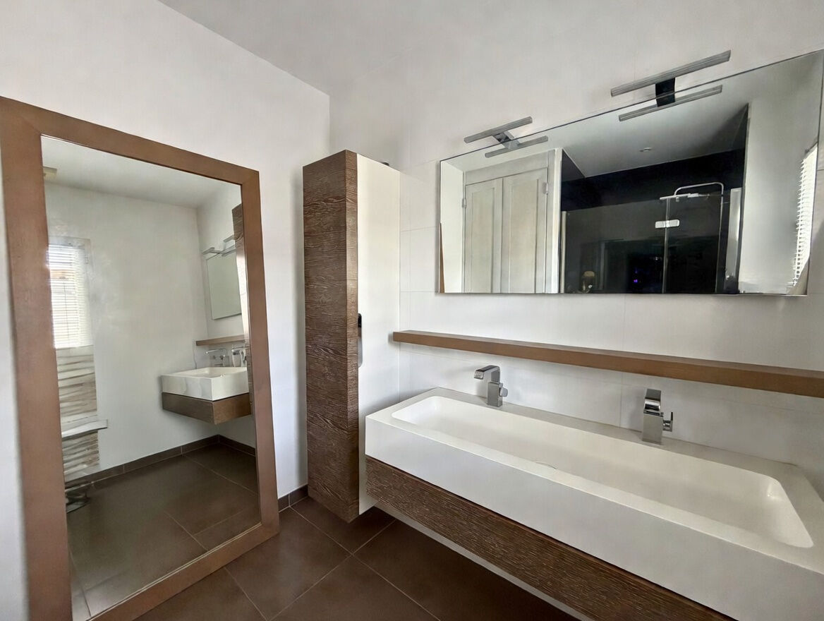 À l'étage, vous trouverez : deux chambres supplémentaires, dont une avec dressing, une salle de douches lumineuse, des toilettes séparées, ainsi qu'un solarium sans vis à vis offrant une vue dominante.