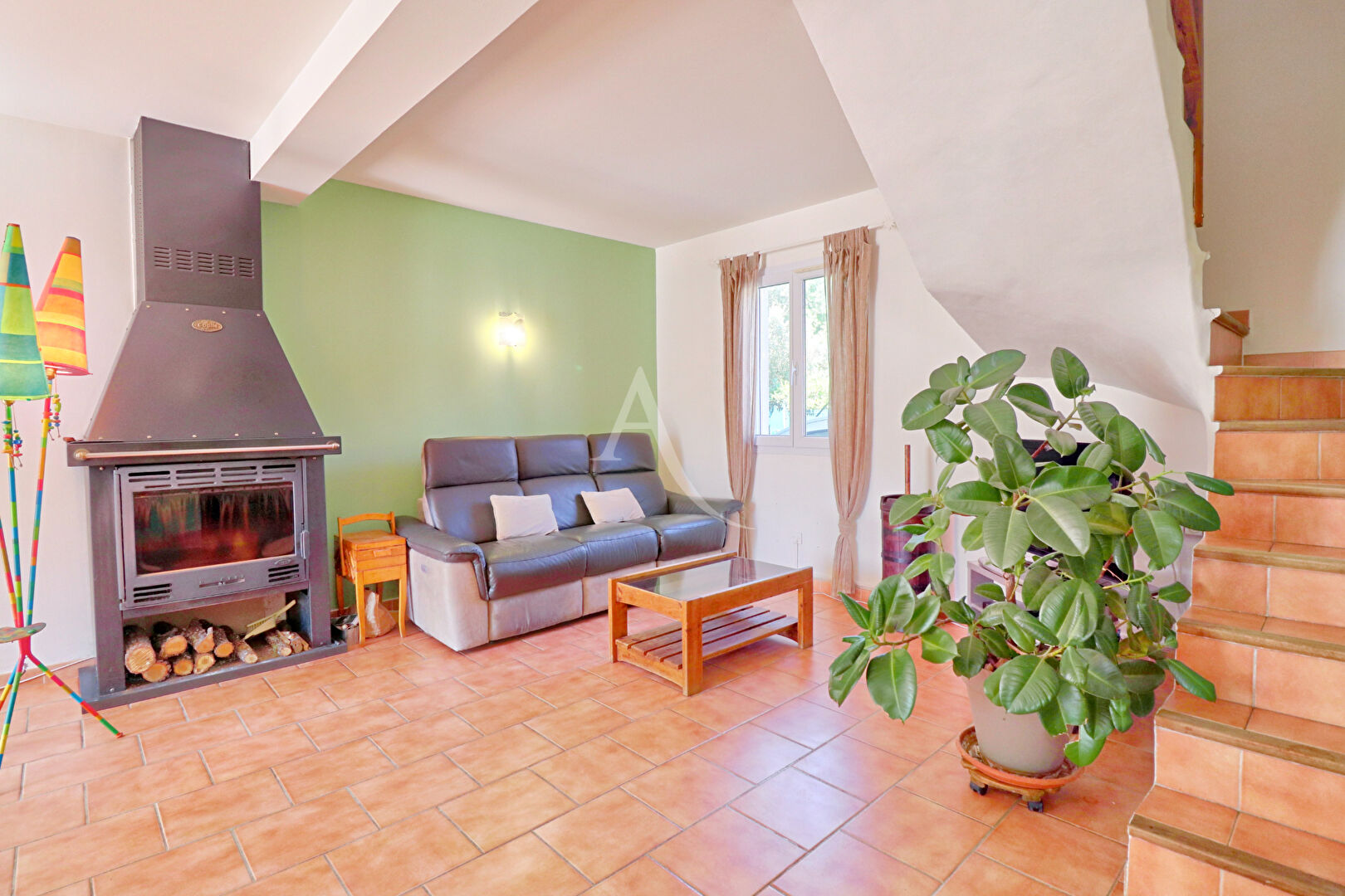 Elle se compose au rez-de-chaussée d'un salon/salle à manger avec poêle à bois, climatisation et cuisine semi séparée aménagée tout deux ouvrant sur la terrasse et le jardin.