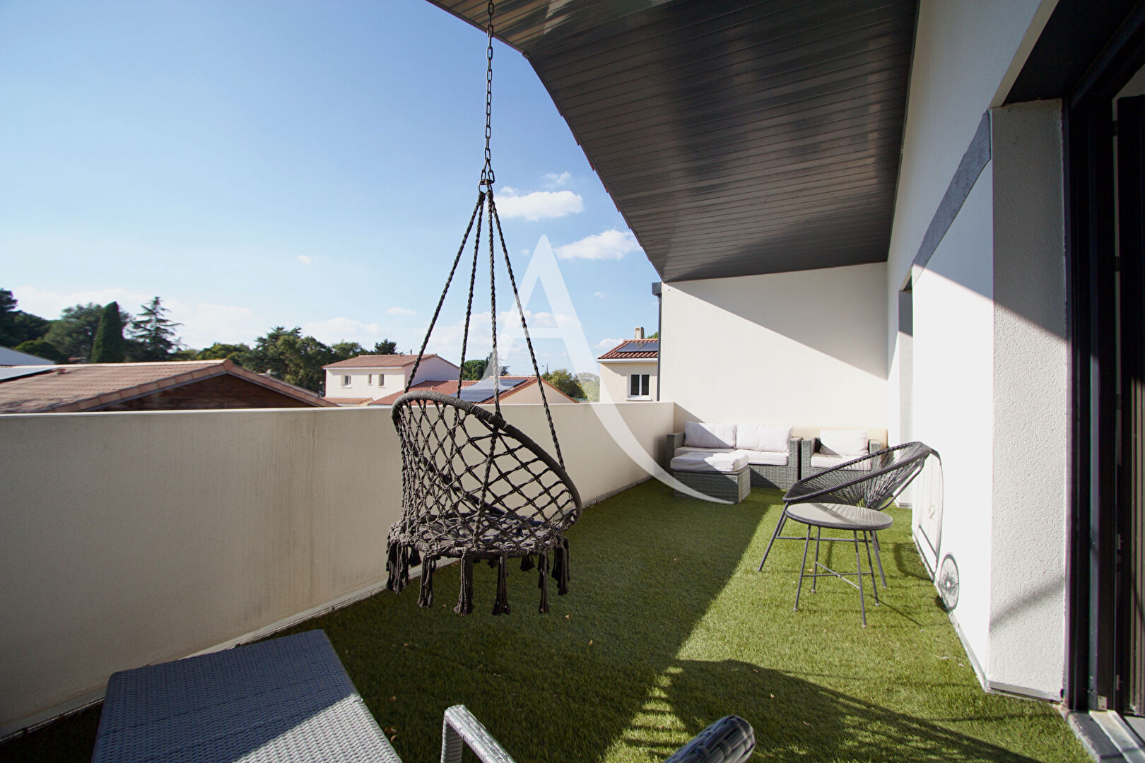 Une terrasse en pelouse synthétique, façon rooftop, offrant une vue dégagée et un espace de vie extérieur supplémentaire.