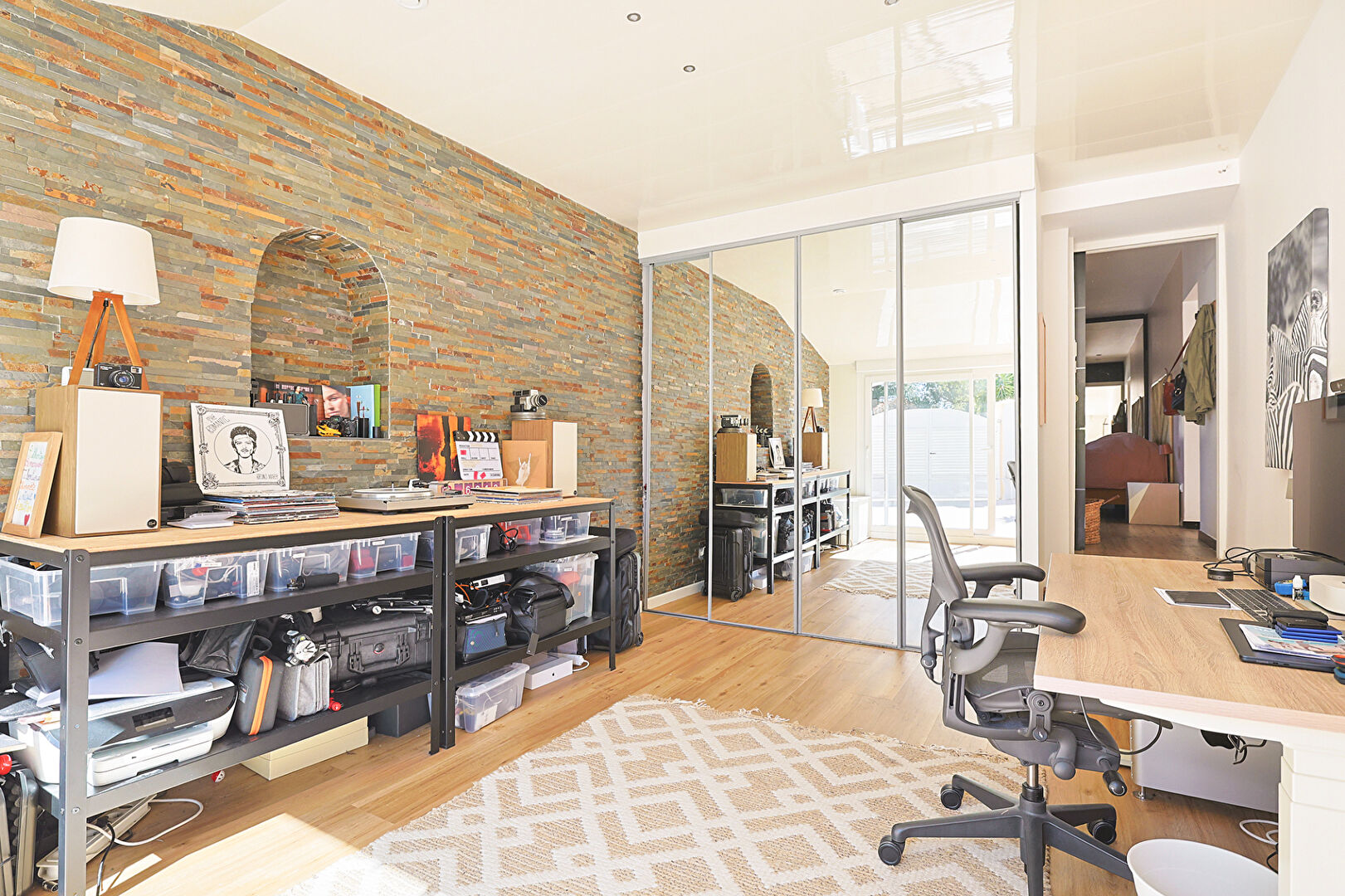 Le rez-de-chaussée propose également une spacieuse suite parentale d'environ 20 m² avec dressing et salle d'eau, ainsi qu'un bureau avec grand placard, accessible depuis la chambre.