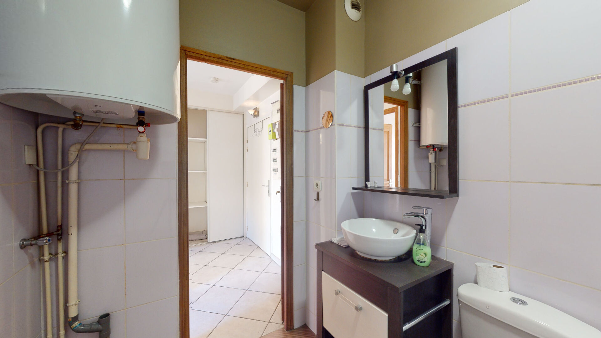 Ce deux pièces comprend une entrée avec placard, un séjour lumineux avec une cuisine ouverte aménagée et équipée ( plaque vitrocéramique, hotte, four encastrable, emplacement pour lave-vaisselle,... ), une salle de bains avec WC et coin buanderie, une cave et une place de parking.