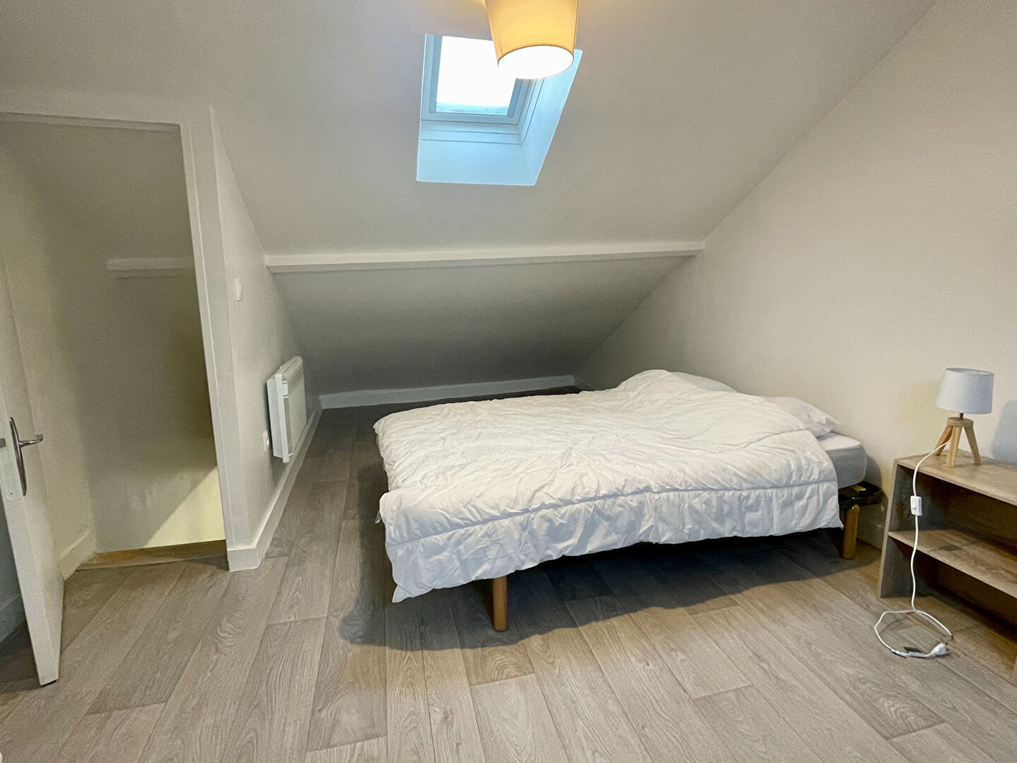 Le logement comprend une cuisine indépendante aménagée et équipée, un salon-séjour, une salle d'eau avec WC et un bureau mansardé en duplex faisant office de chambre.
