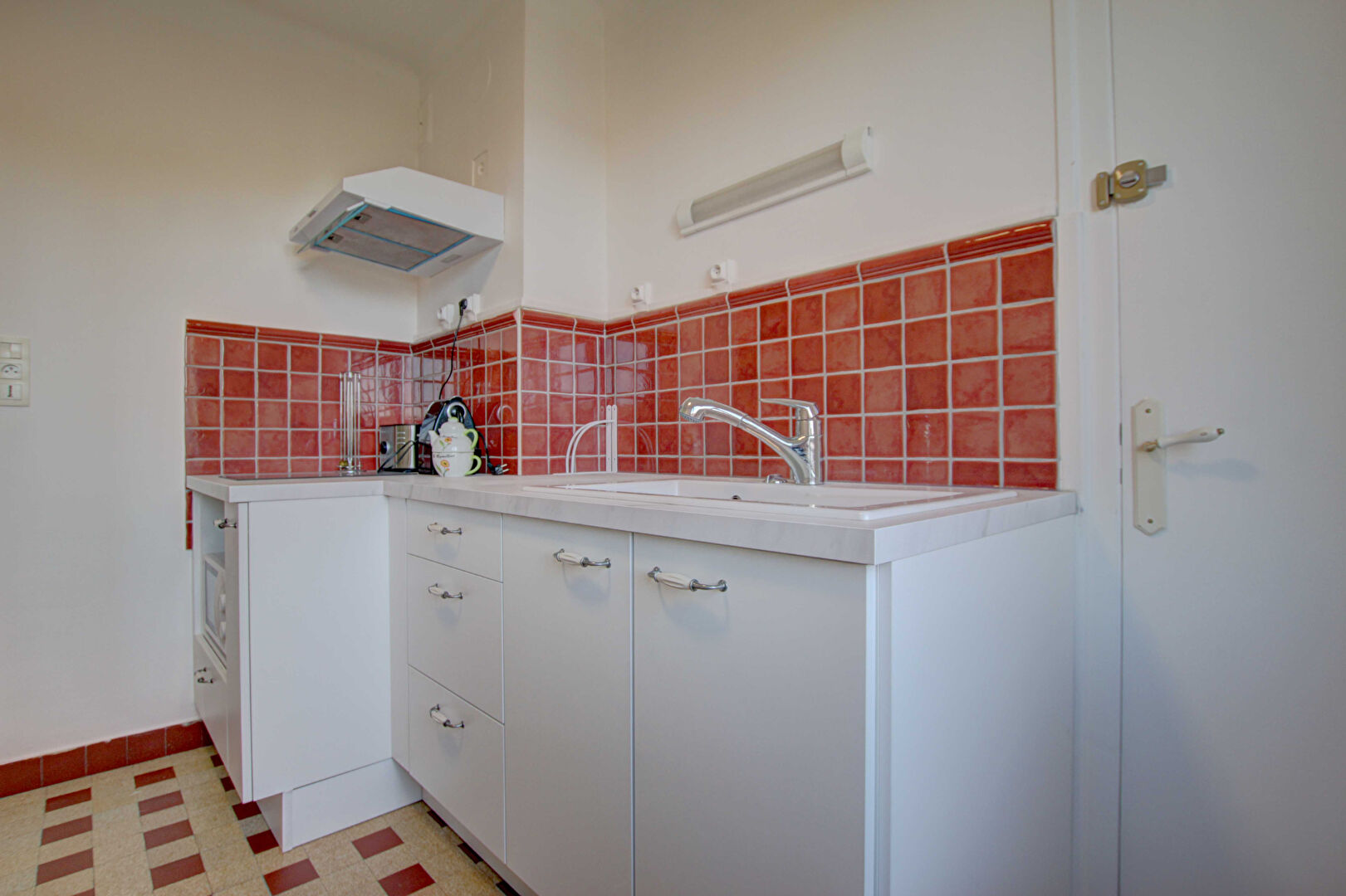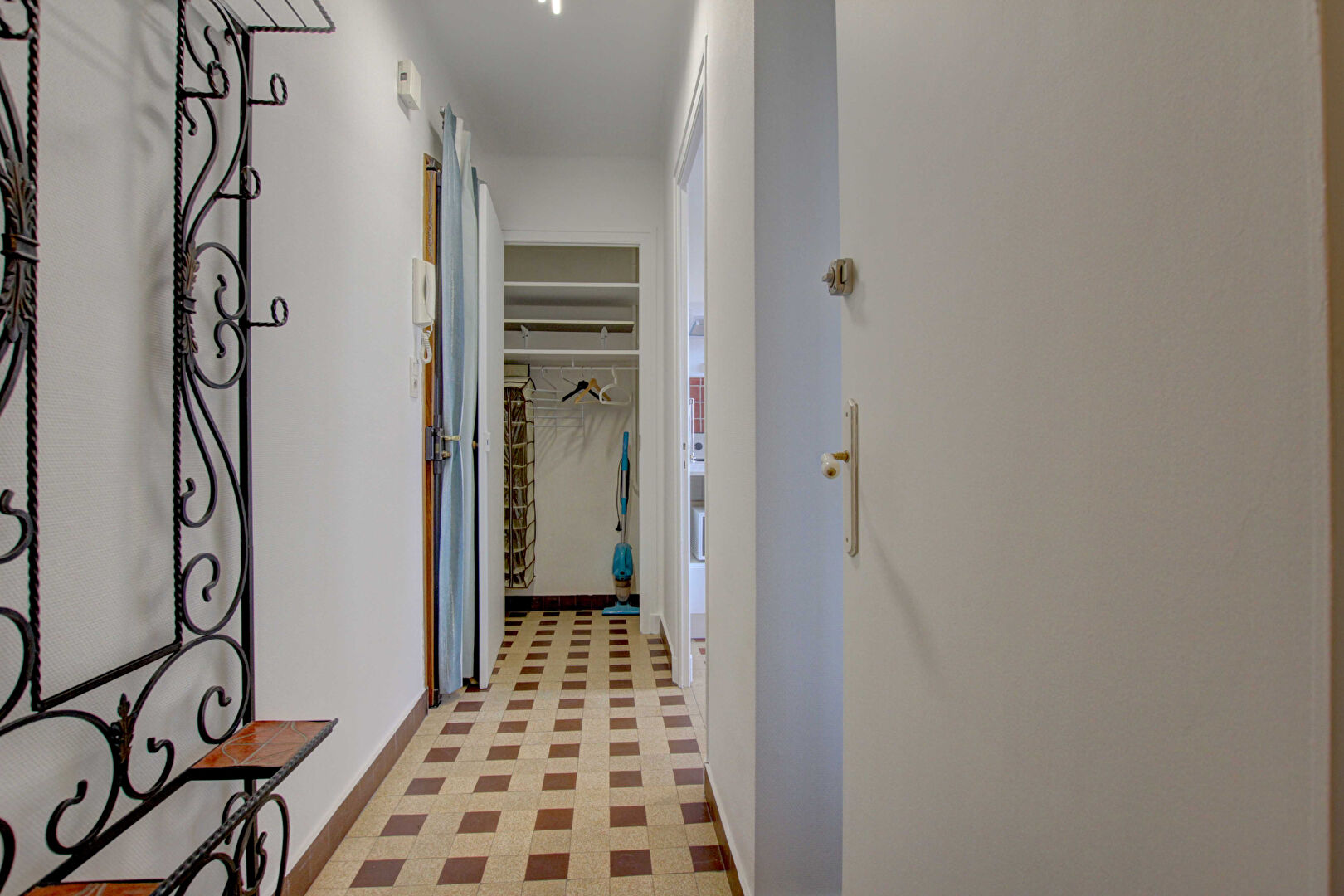 Il se compose d'une entrée avec placard de rangements, d'une cuisine fermée aménagée et équipée (plaques de cuisson, four micro-ondes, hotte, réfrigérateur), d'un salon équipé d'un canapé lit, d'une buanderie avec emplacement pour machine à laver et d'une salle d'eau avec WC.