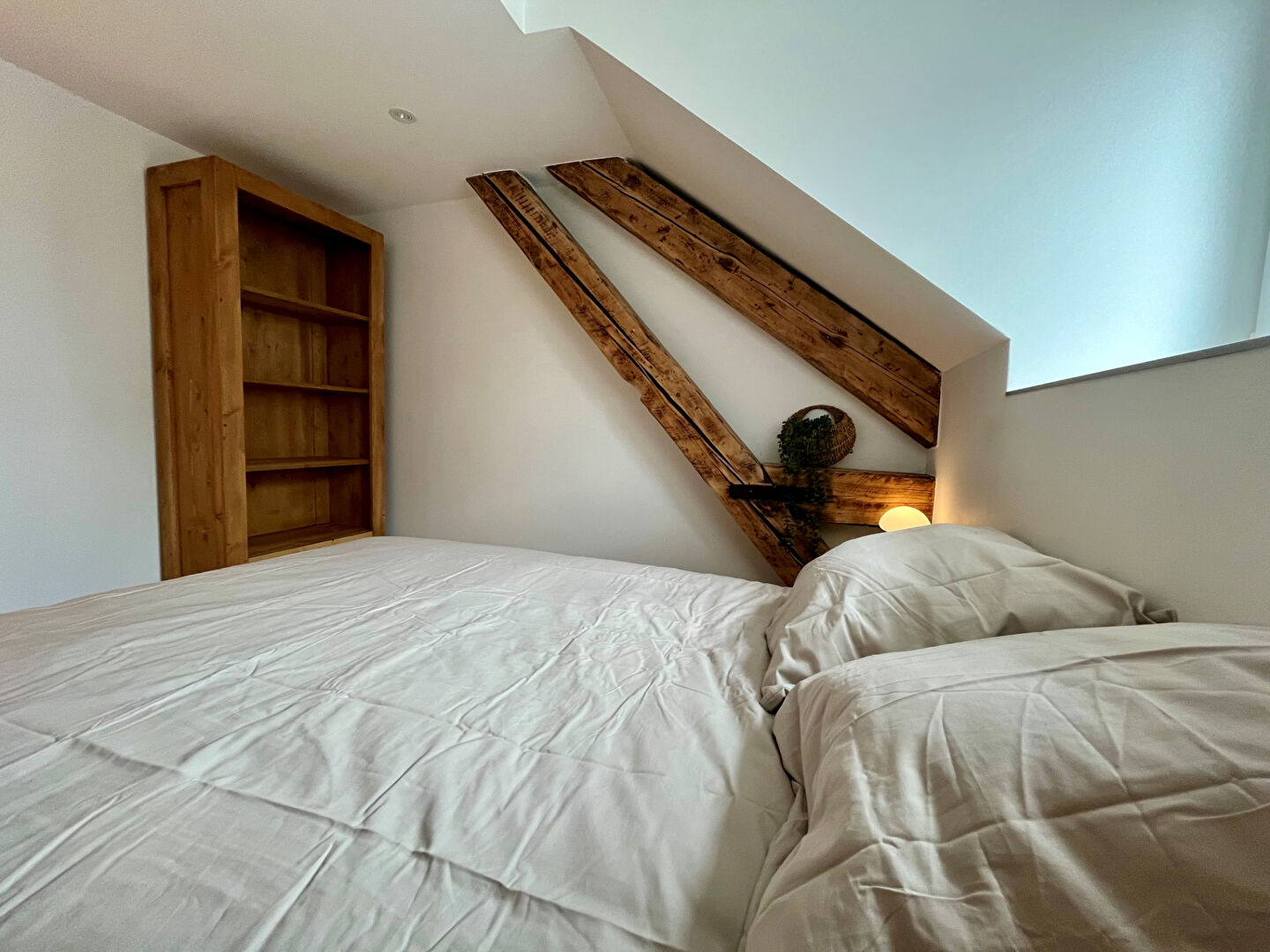 Une mezzanine à hauteur sous plafond partielle vient apporter un espace complémentaire, idéal pour un couchage d'appoint ou du rangement.