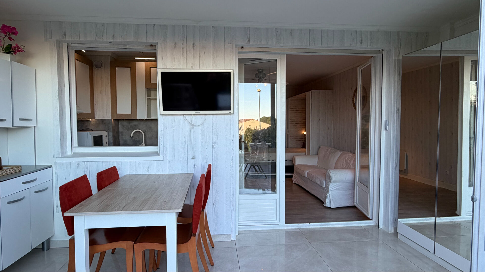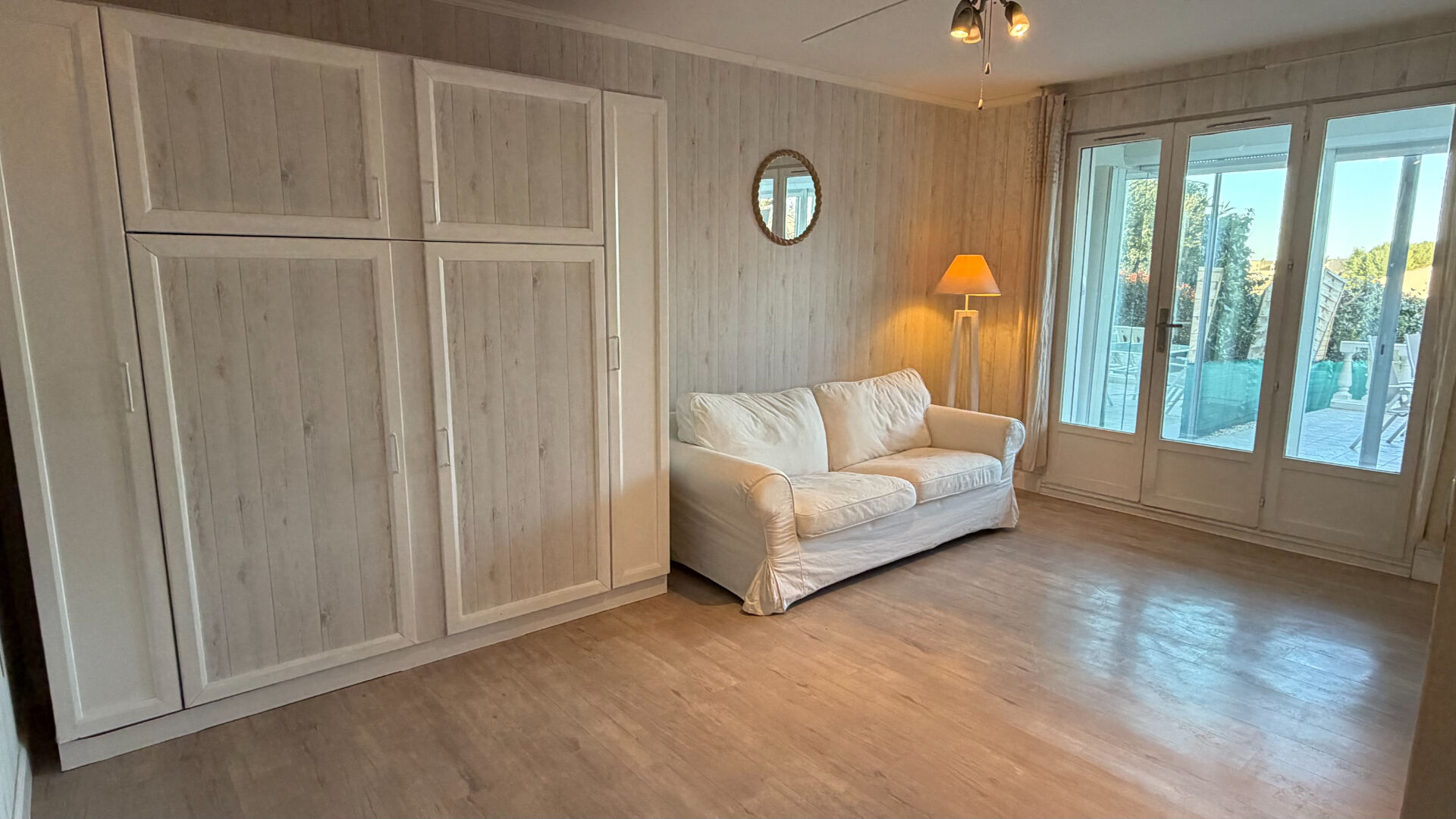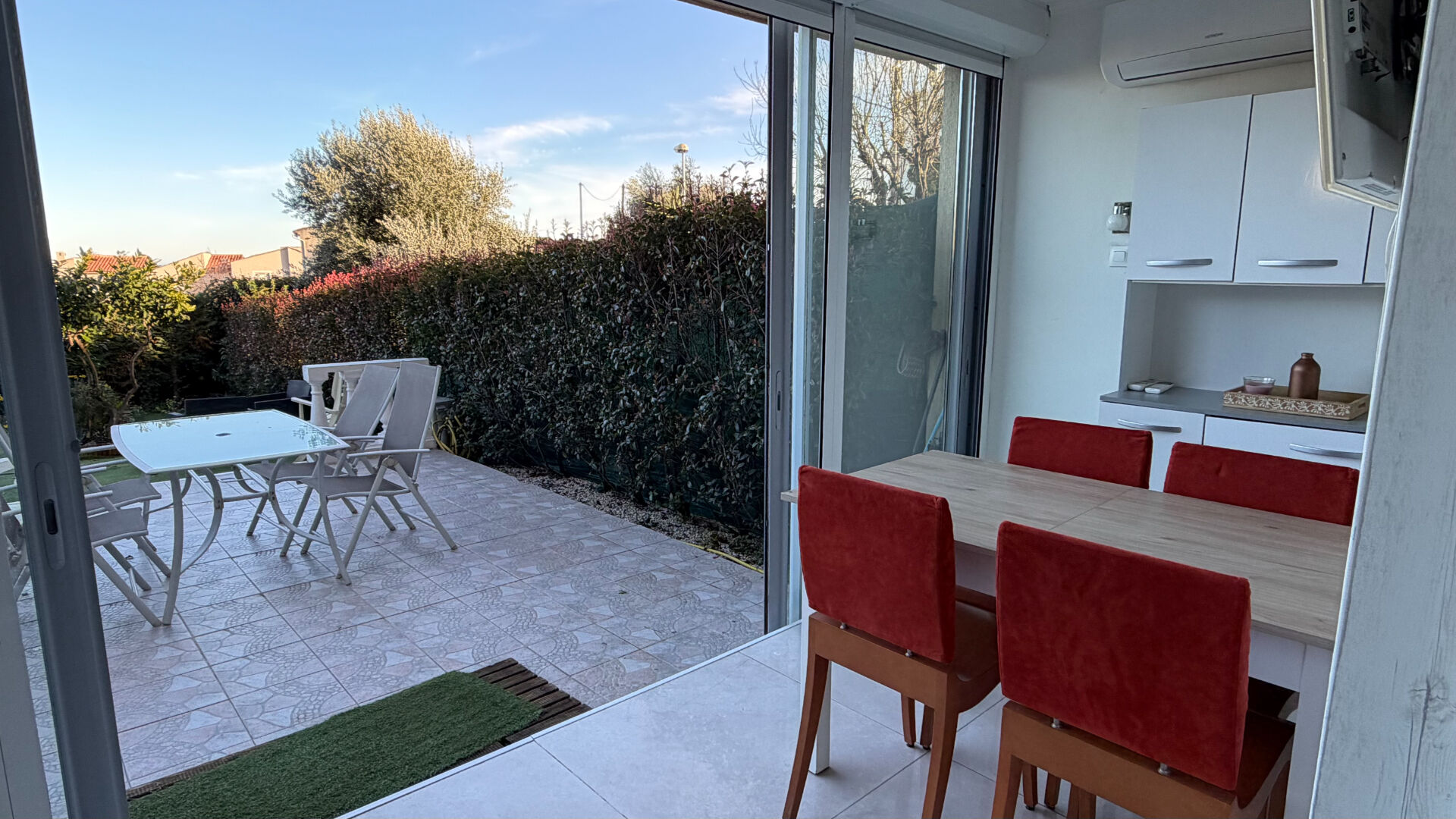Cet appartement lumineux se compose d'une entrée, d'une pièce principale avec coin salon et coin couchage avec son lit escamotable s'ouvrant sur une véranda aménagée en salle a manger, d'une cuisine ouverte entièrement meublée et équipée, et d'une salle de bains avec WC. La véranda climatisée s'ouvre sur une belle terrasse et un jardin privatif exposés plein sud, parfaits pour profiter du soleil et des moments de détente en extérieur.