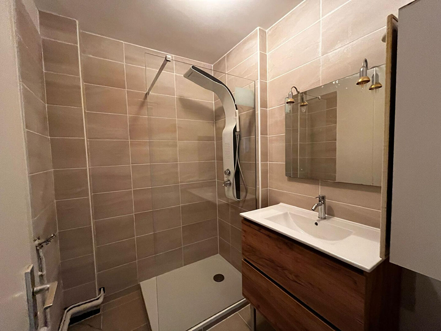 En face de l'entrée se trouvent la seconde chambre, la salle d'eau avec douche et meuble vasque, ainsi qu'un WC séparé.