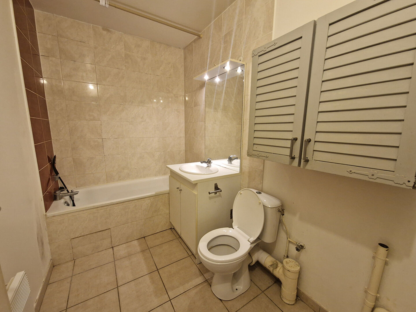 Appartement de 2 pièces principales situé en rez-de-jardin comprenant une entrée avec placards, une chambre, une salle de bain avec w.c, un séjour et une cuisine partiellement aménagée.