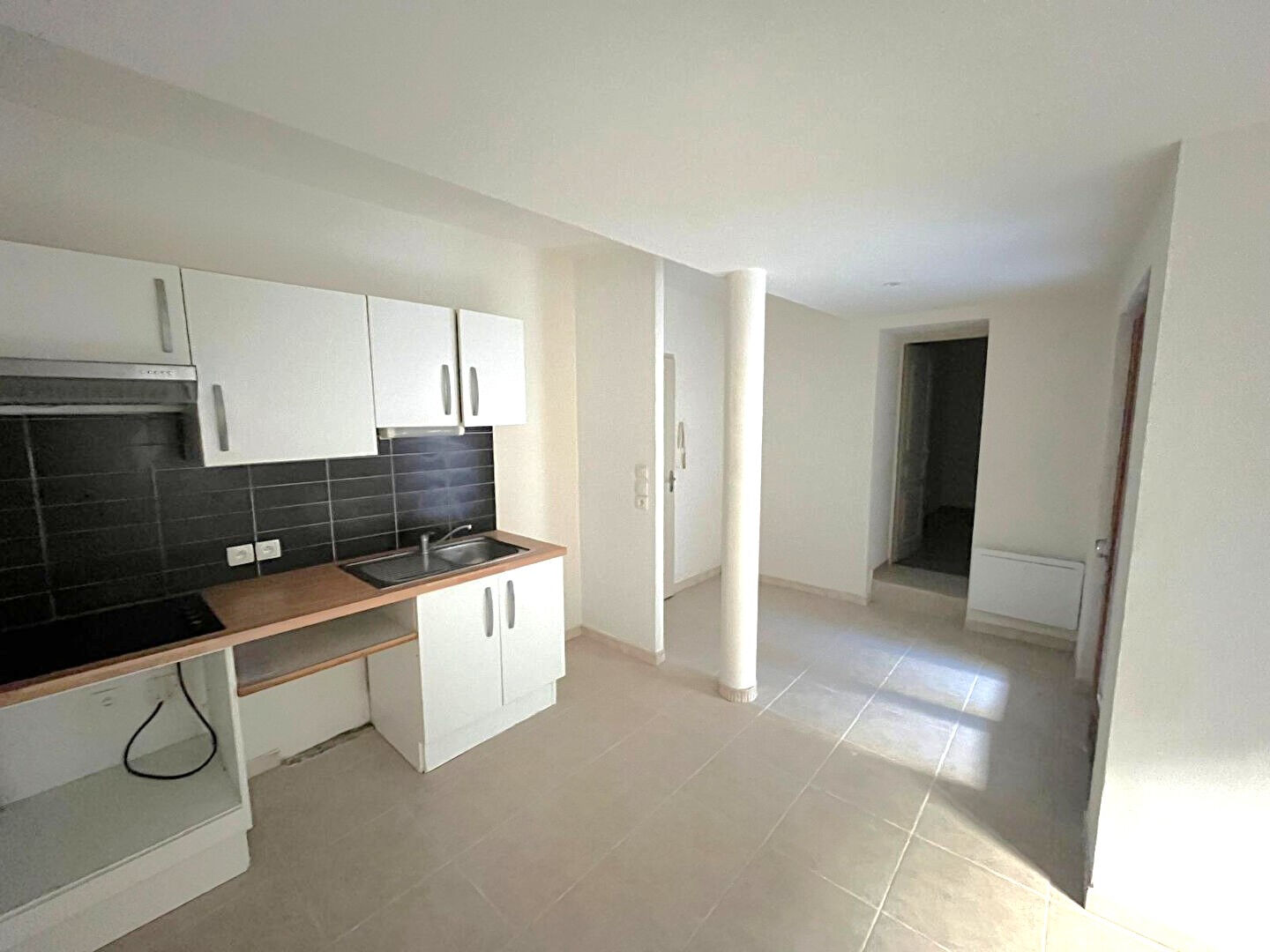 l comprend, une entrée, une salle d'eau donnant sur une buanderie, un WC indépendant, une pièce à vivre avec cuisine équipée d'une plaque de cuisson et d'une hotte, une chambre et une cour d'environ 13 m².