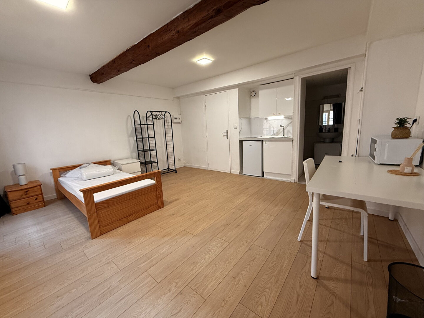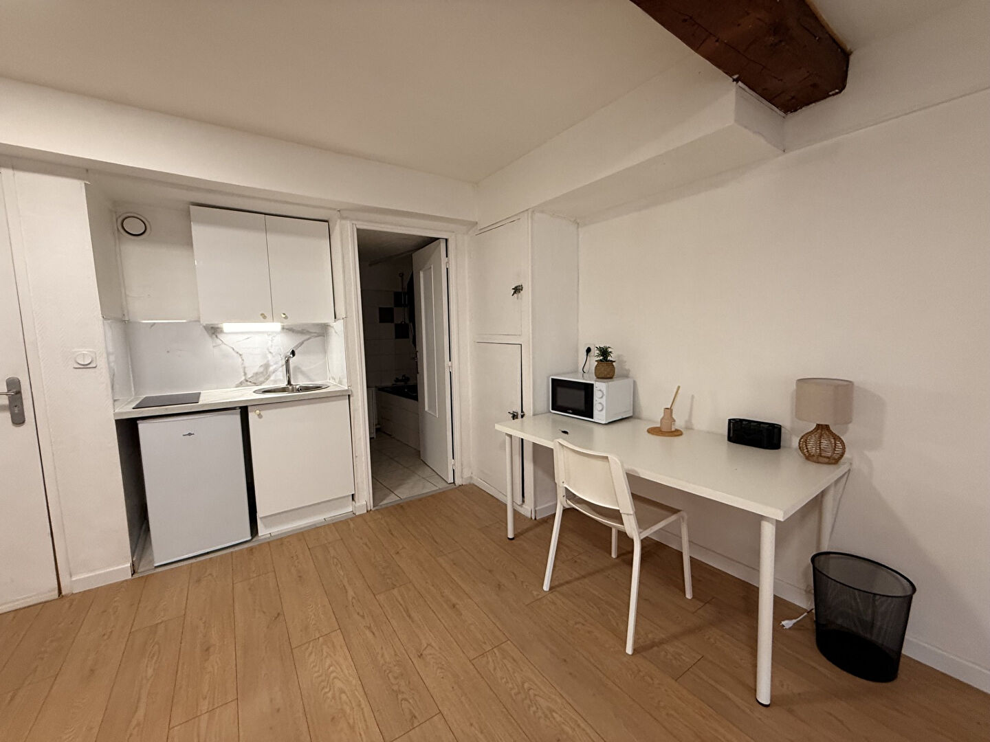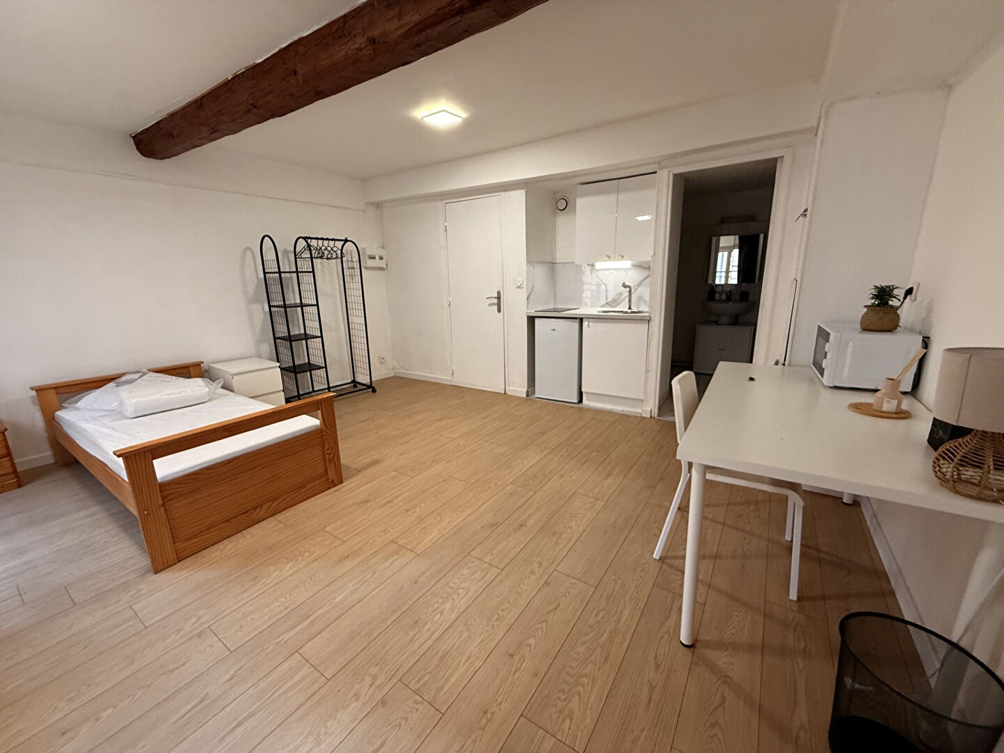 Une pièce de vie avec coin nuit, rangement et bureau, une cuisine meublée à part et une salle d'eau avec wc.