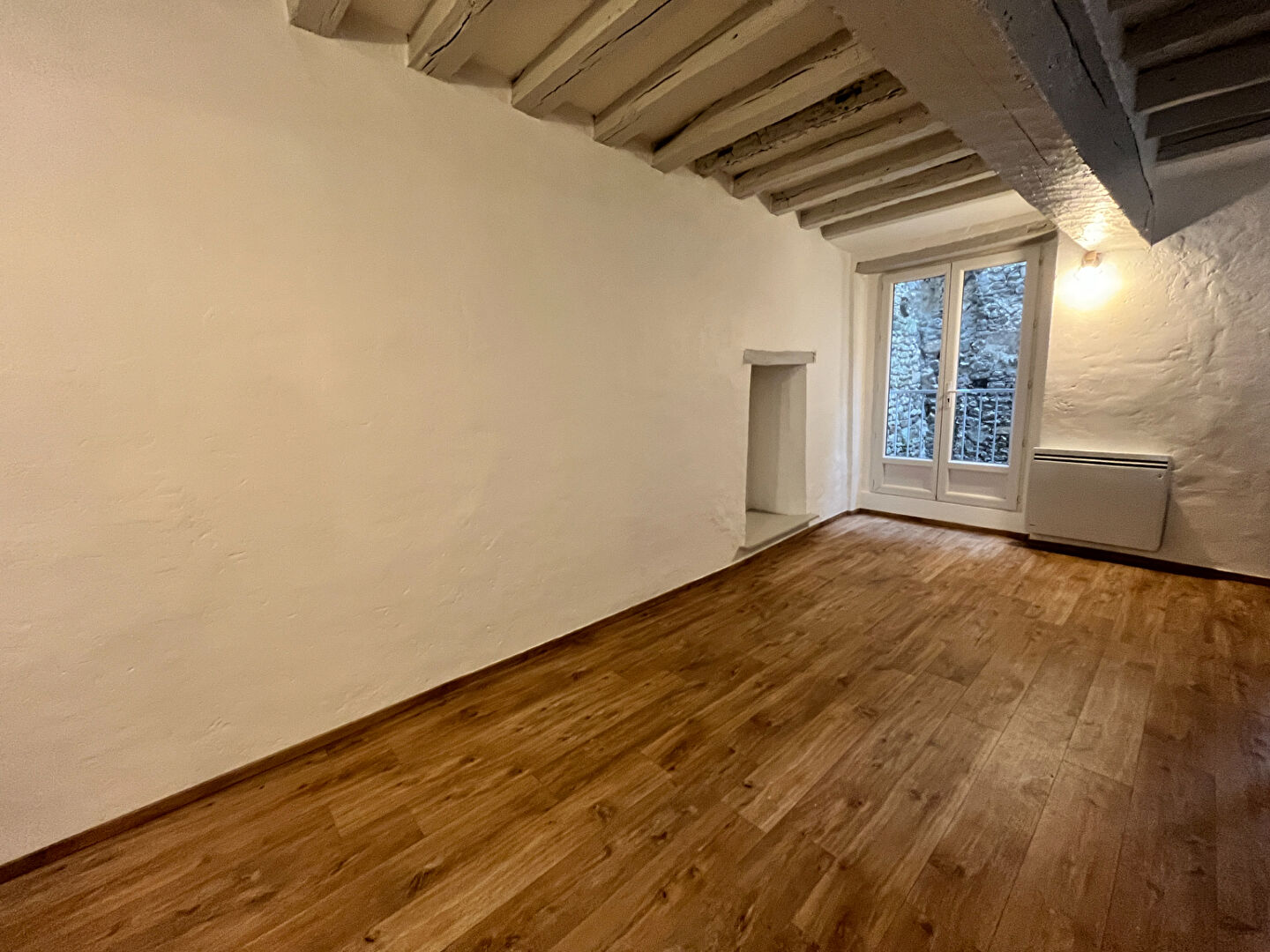 A l'entrée, salon/séjour, cuisine ouverte, une salle d'eau et une chambre.