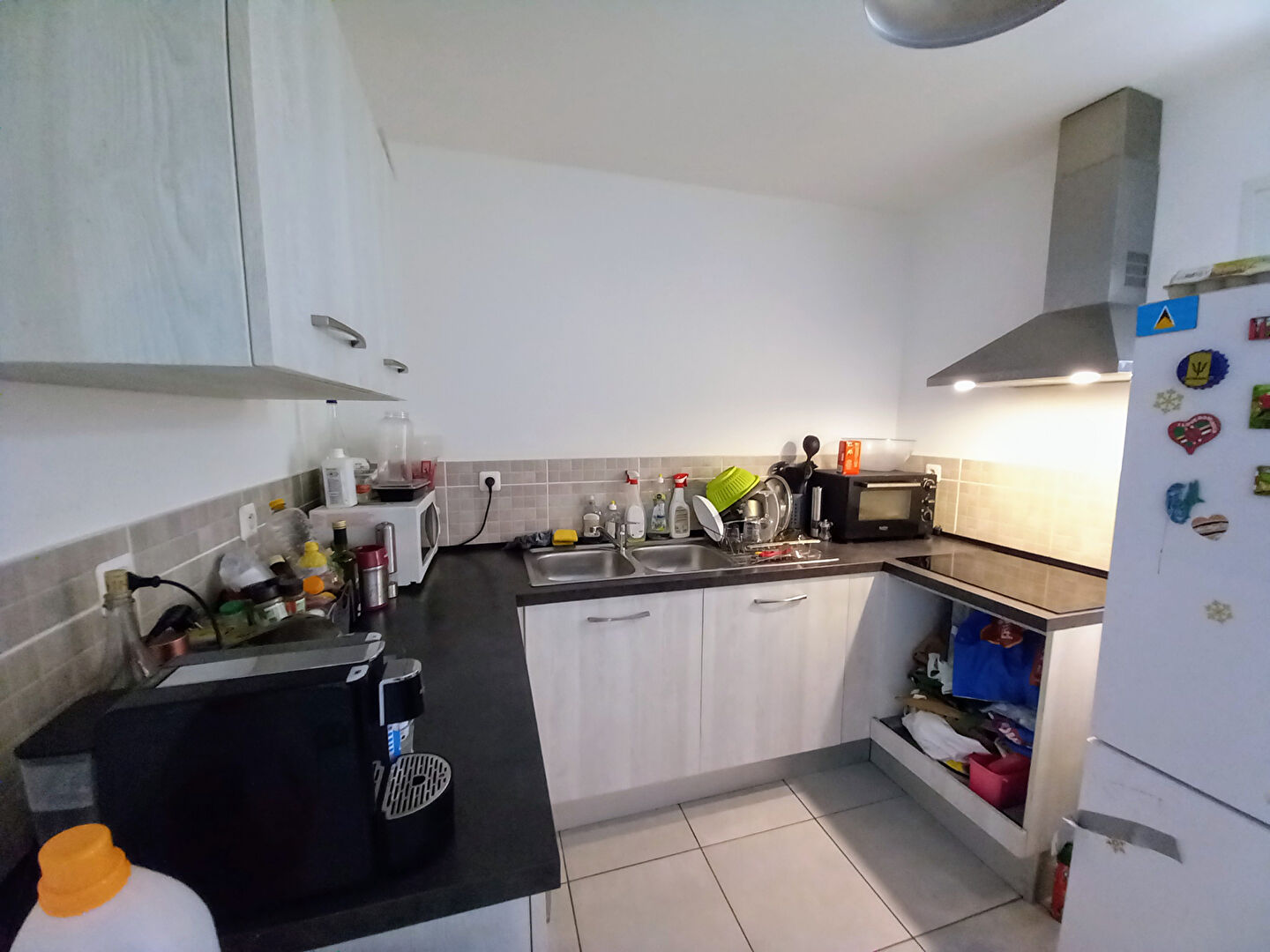 Cuisine aménagée (meubles, plaque, hotte).