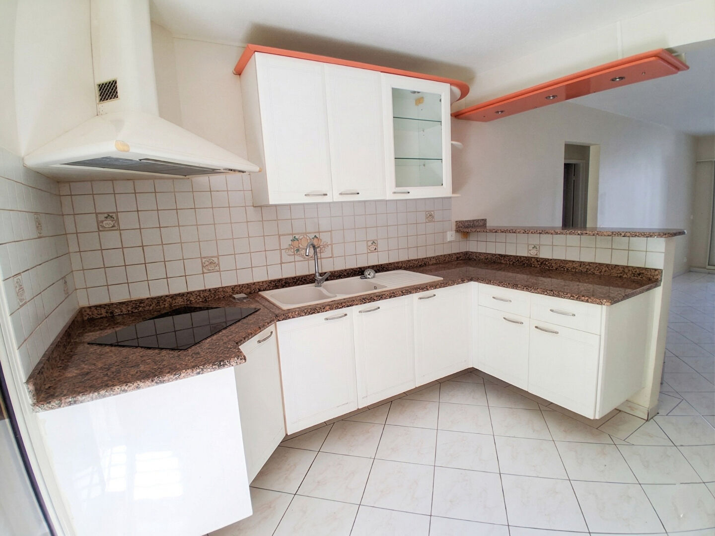 Cuisine équipée : Meubles hauts/bas, plaques, hotte, ouverte sur le séjour par un comptoir bar.