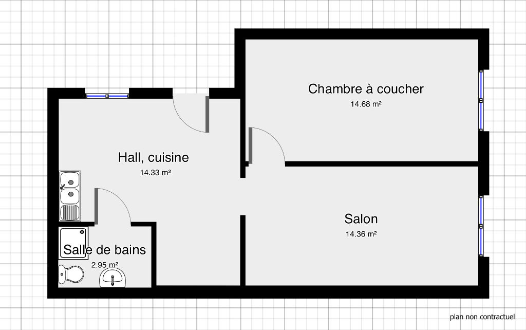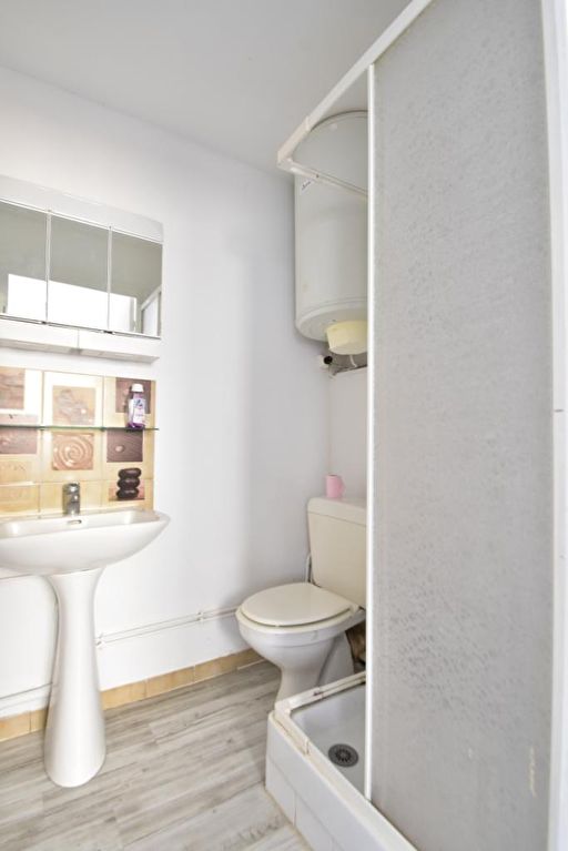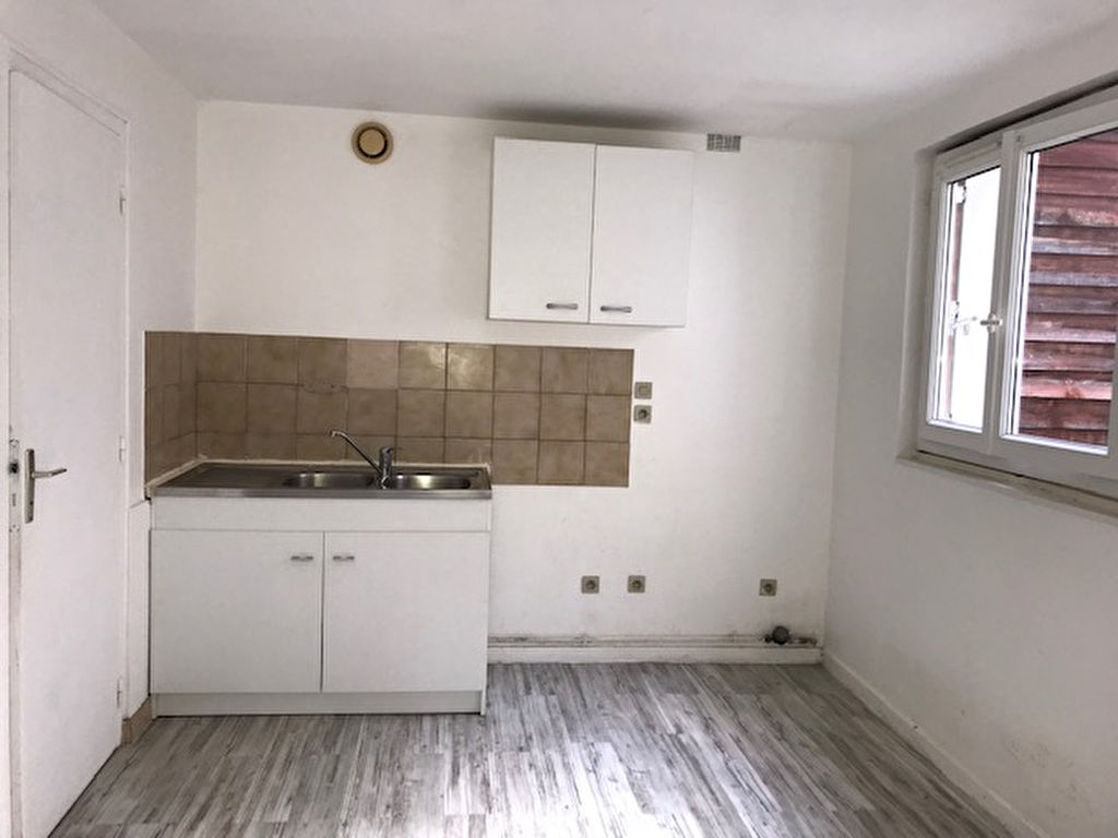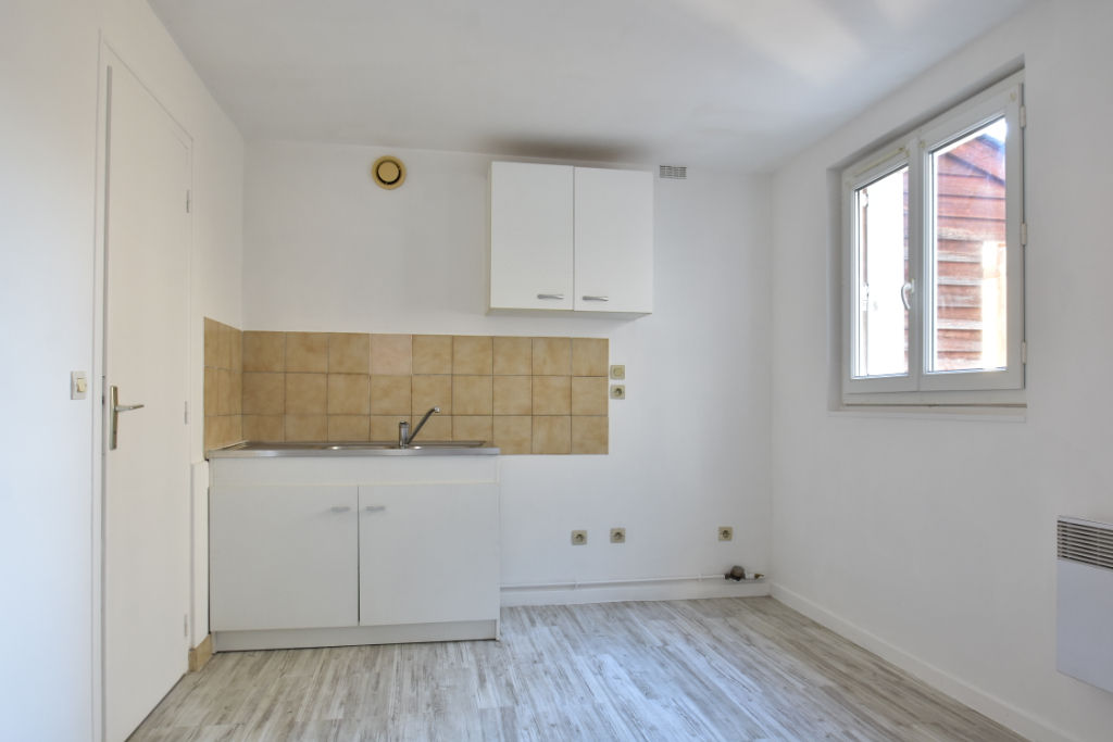 Entrée sur cuisine, salle de douche et WC, un séjour et une chambre avec placard.