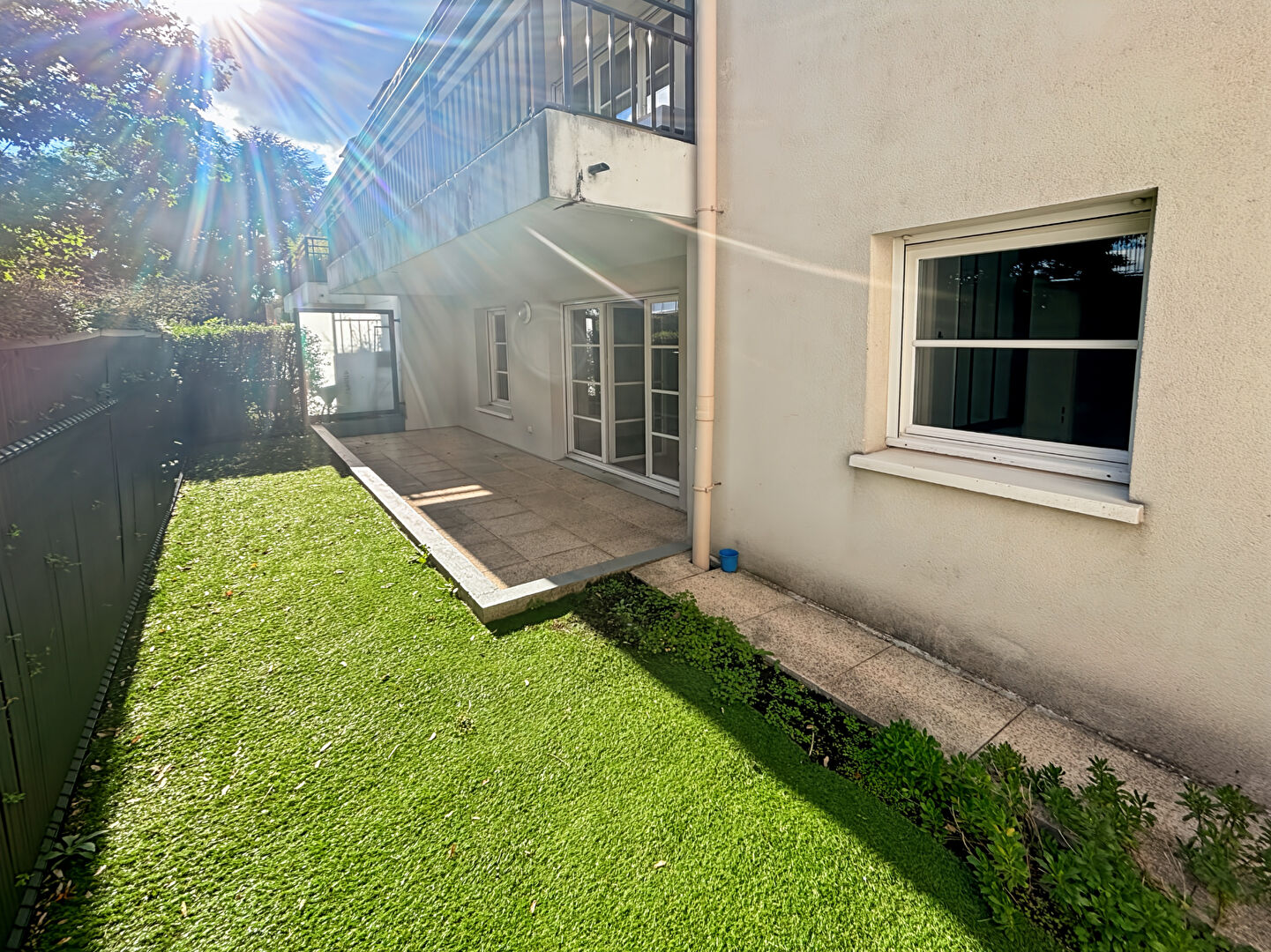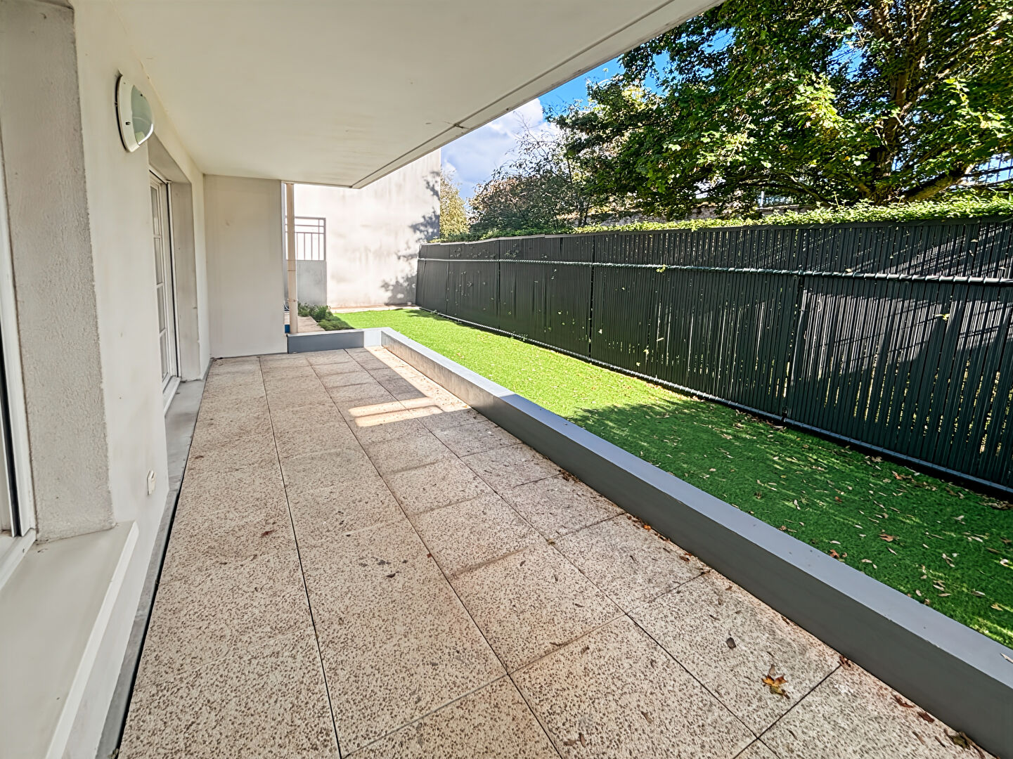 Un jardin avec une terrasse.