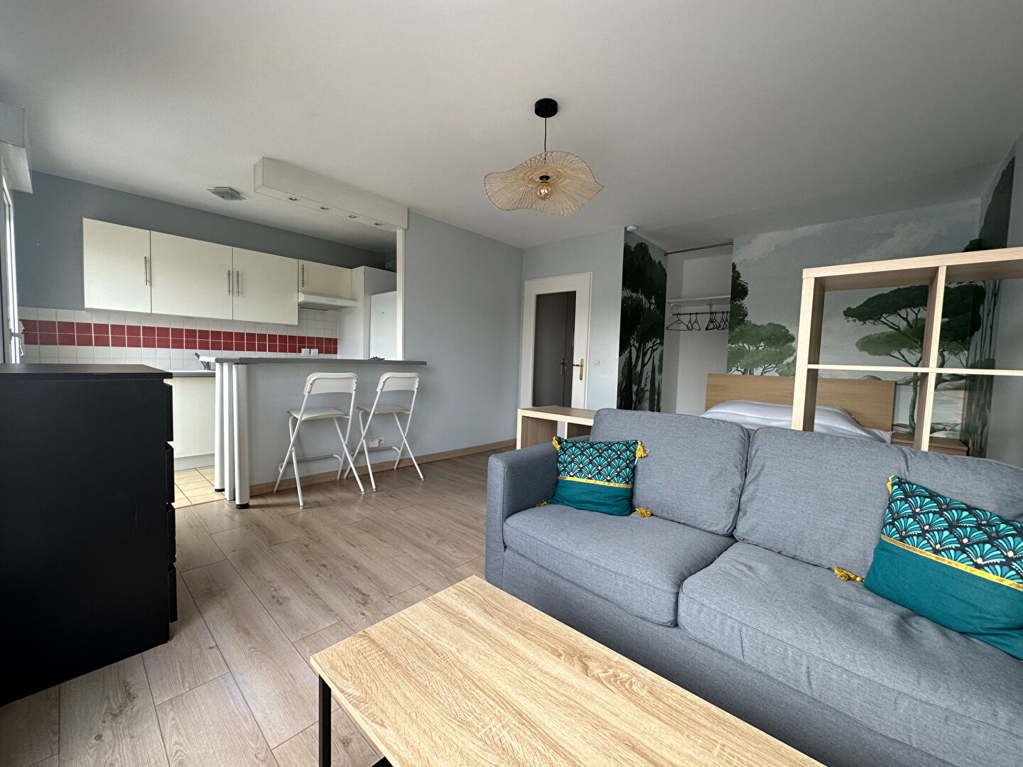 Studio meublé idéalement placé en centre ville, à 5 min de la gare , comprenant une entrée, une salle de bains avec WC, pièce principale avec placard, cuisine américaine aménagée et équipée et un balcon