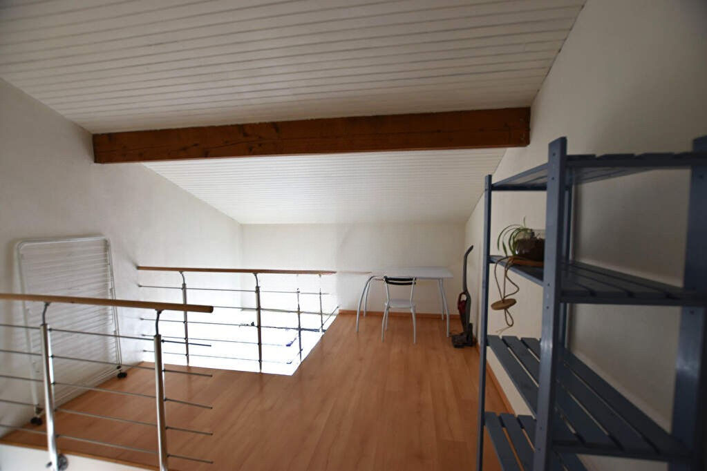 L'appartement se compose d'une entrée donnant sur un salon climatisé avec accès au balcon, une cuisine séparée et équipée (four, hotte, plaque et frigo), à l'étage, une chambre, une salle d'eau et une mezzanine avec un bureau.